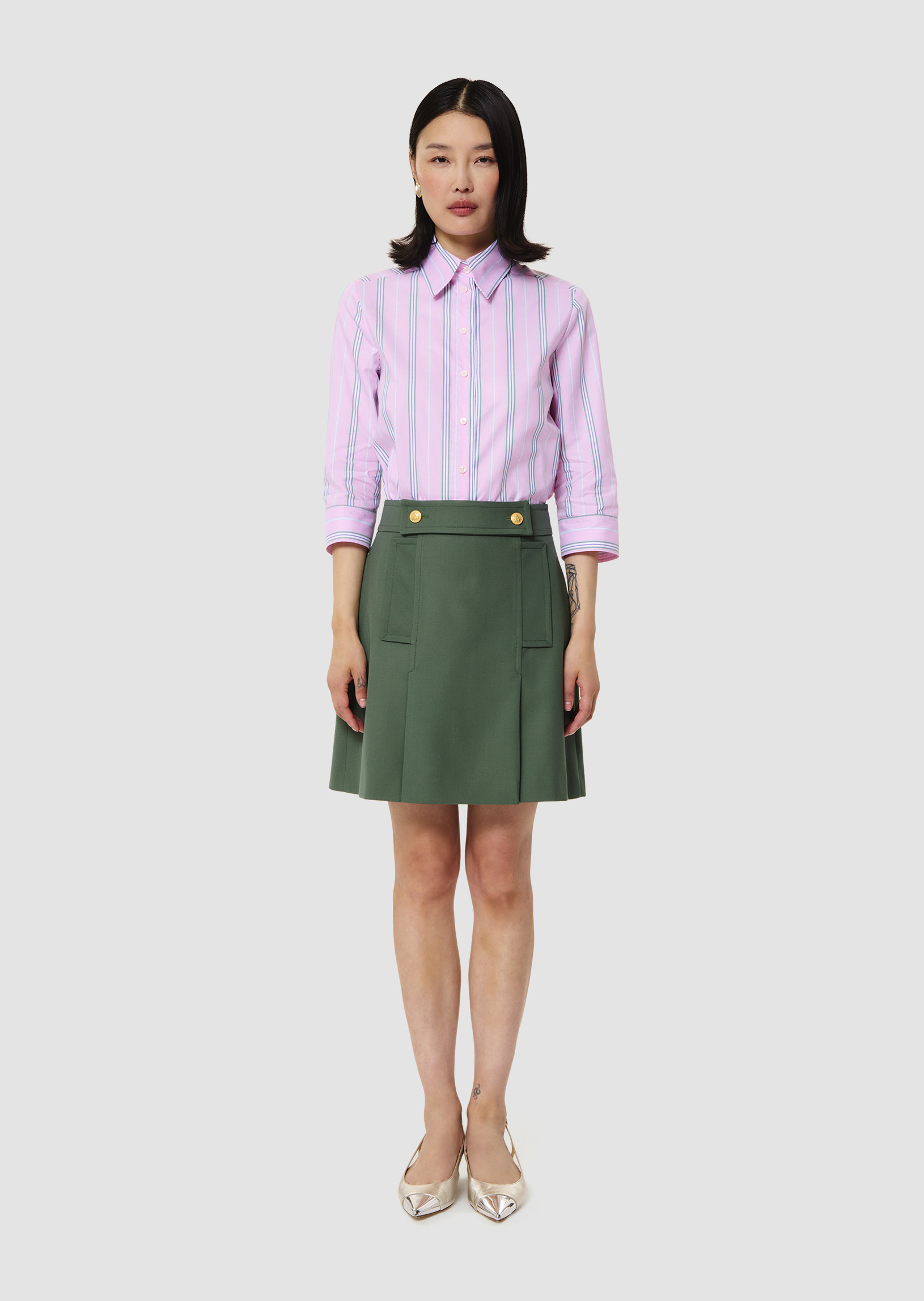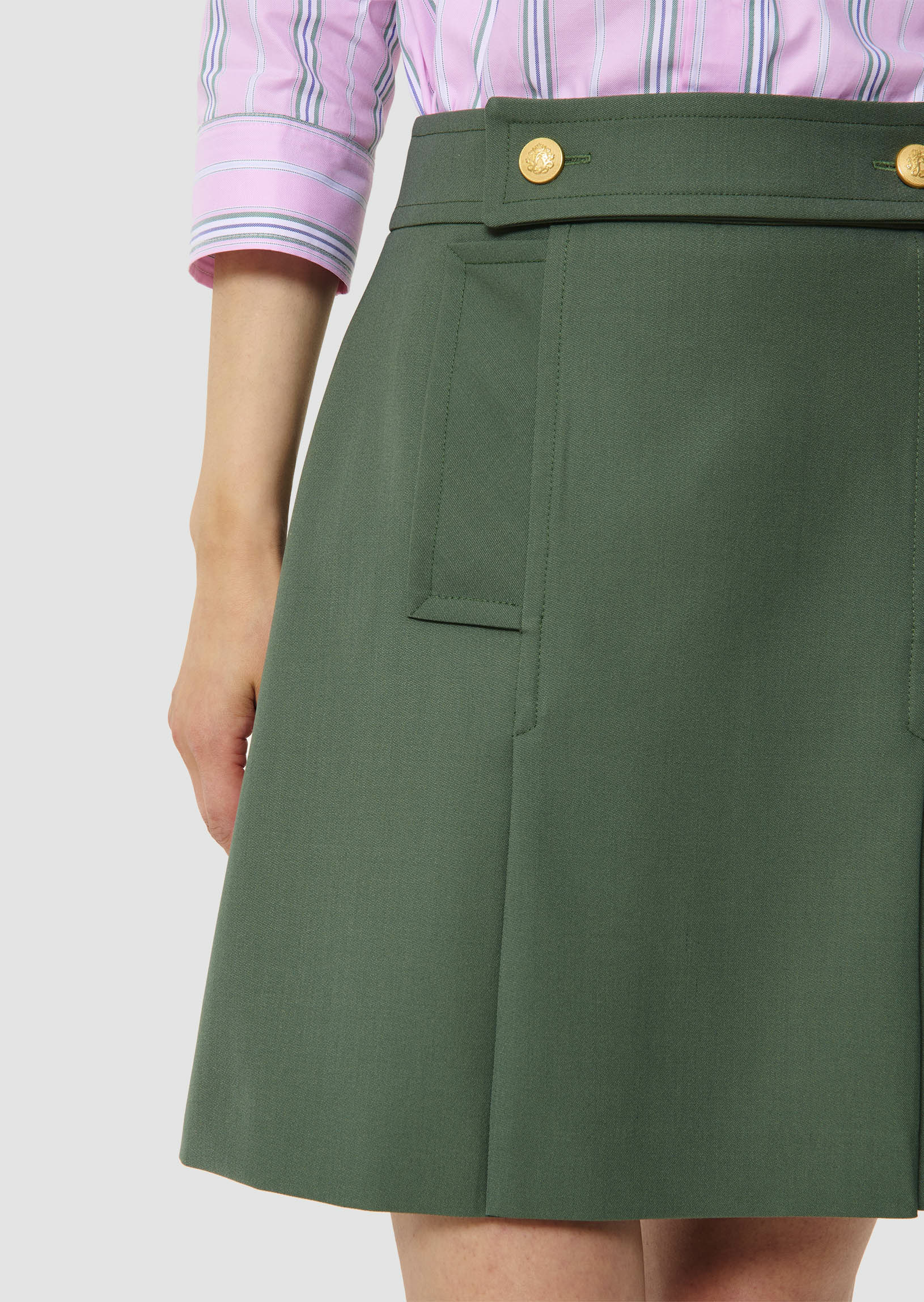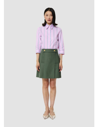 Cette jupe courte style écolière en laine tailleur couleur thym possède une coupe trapèze agrémentée de plis plats. Elle possède deux poches aux côtés et sa taille est marquée par un empiècement ton sur ton boutonné par de jolis boutons dorés. Une poche passepoilée décorée d’un bouton doré orne l’arrière. Elle se ferme à l’arrière par un zip invisible.