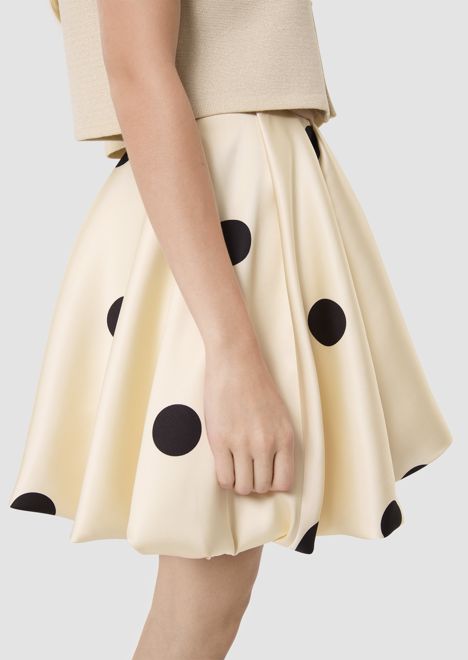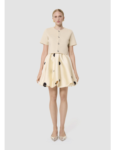 Cette jupe courte écrue imprimé gros pois noirs possède une coupe ultra bouffante structurée. Confectionnée en satin duchesse, c'est la pièce forte pour un look élégant et féminin.
