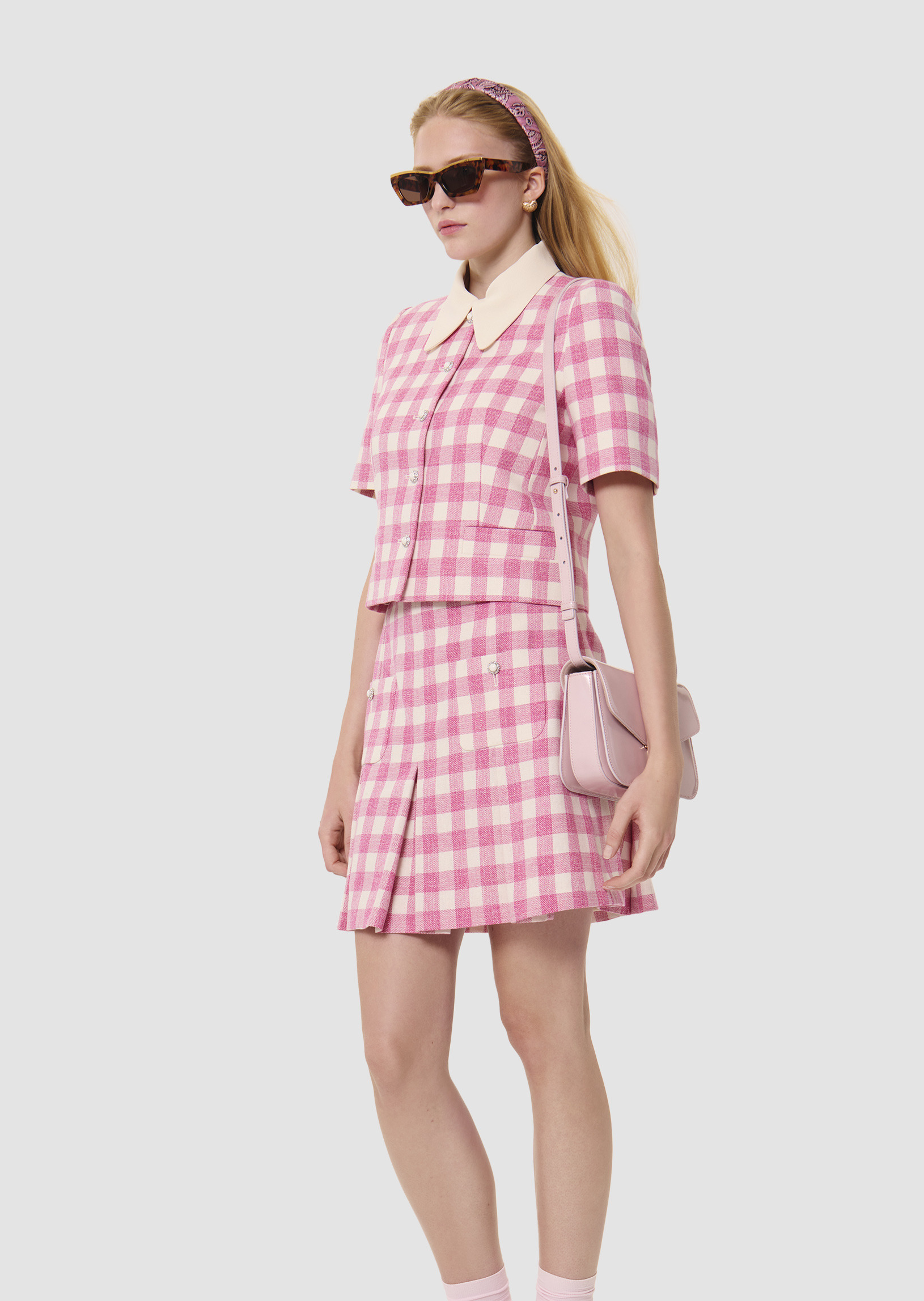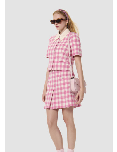 Cette jupe courte imprimé vichy de couleur rose bonbon et écru a une coupe droite et des plis creux lui donnant du mouvement. Elle possède deux petites poches plaquées au devant décorées de boutons bijoux. Elle se ferme au côté par un zip invisible. Optez pour un total look preppy avec la veste Vanita assortie.