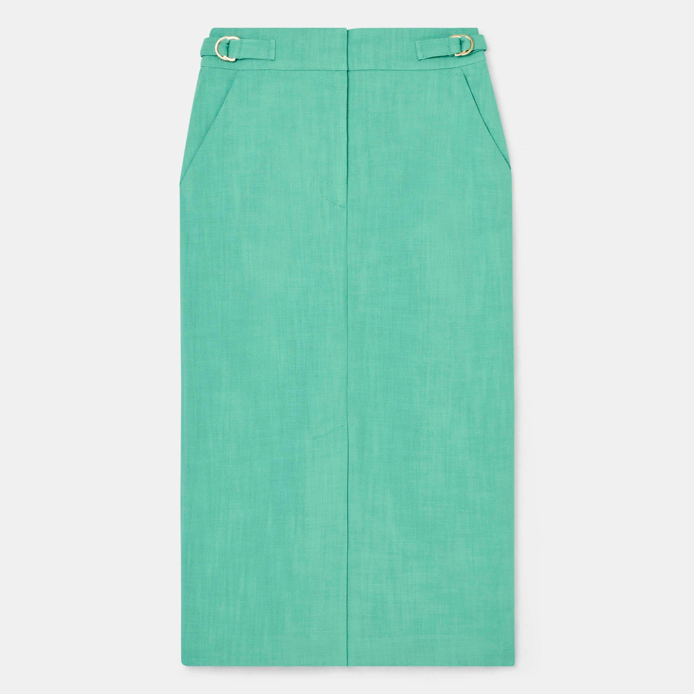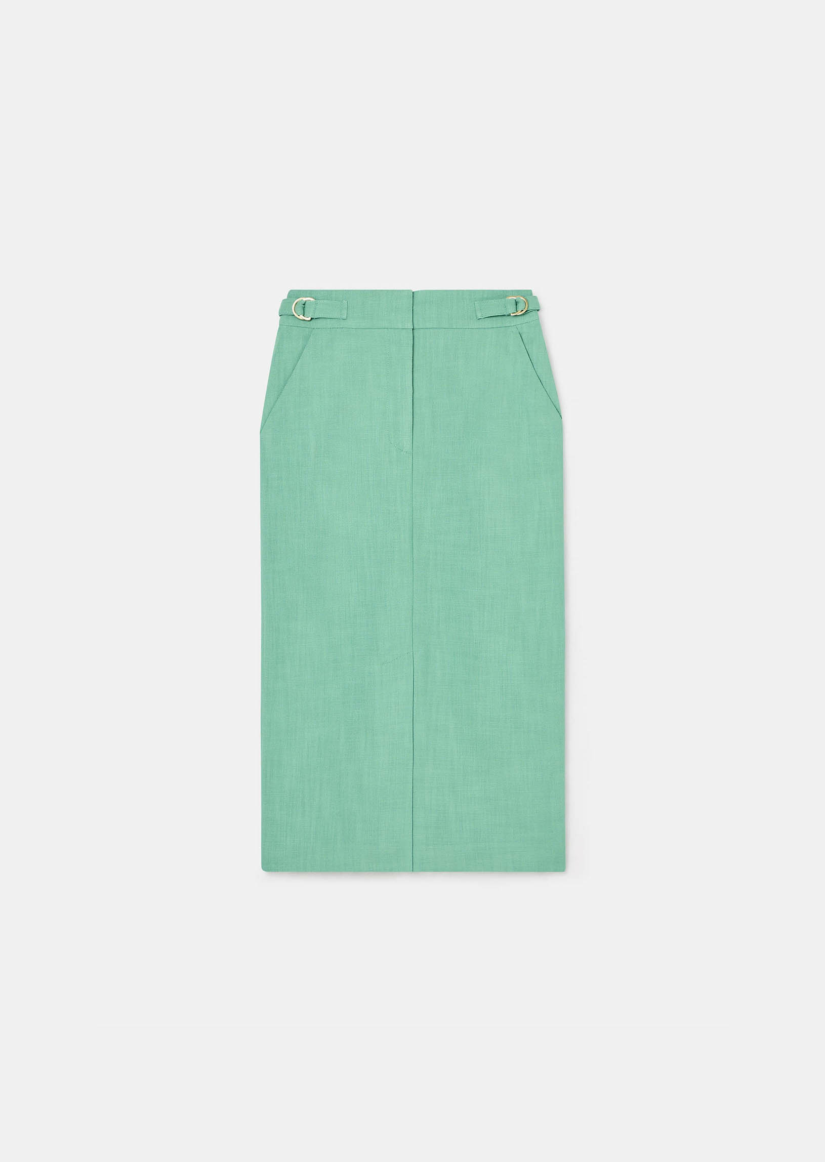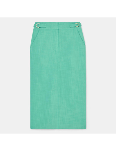 Cette jupe verte en tissu flammé possède une coupe crayon mi-longue. Elle est taille haute et a de petites sangles aux côtés pour ajuster la taille. Une large fente au devant laisse découvrir les genoux pour une allure ultra féminine. Elle possède deux poches italiennes aux côtés et une poche passepoilée à l'arrière. Elle se ferme grâce à un zip et une agrafe.