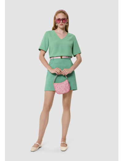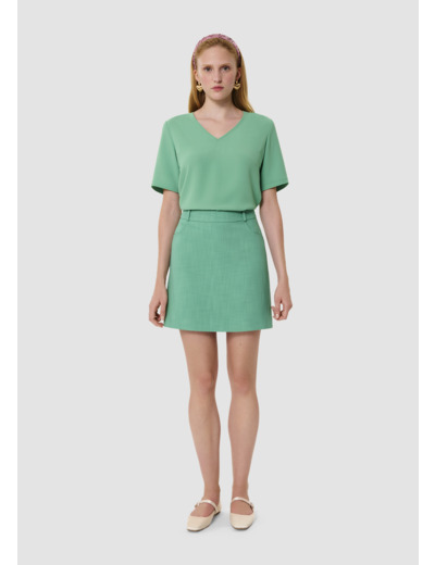 Cette jupe courte de tailleur verte possède une coupe droite, des passants pour y ajouter une ceinture et deux poches aux côtés. Elle se ferme par un zip invisible au dos. On la porte avec la veste Vinny assortie pour un total look ultra féminin et coloré.