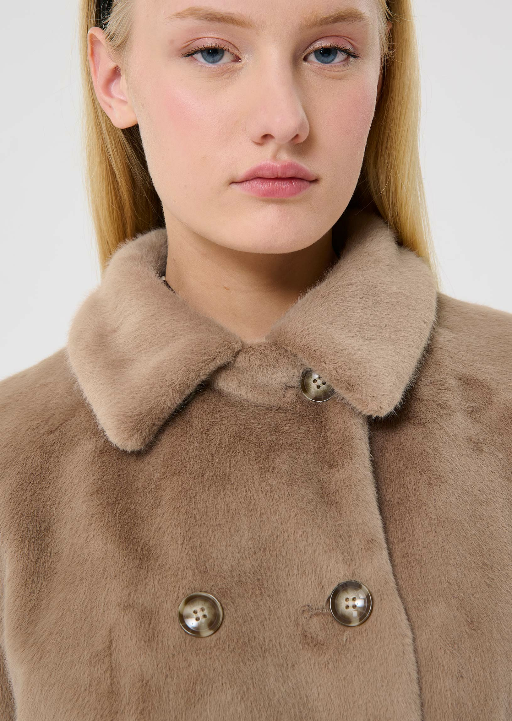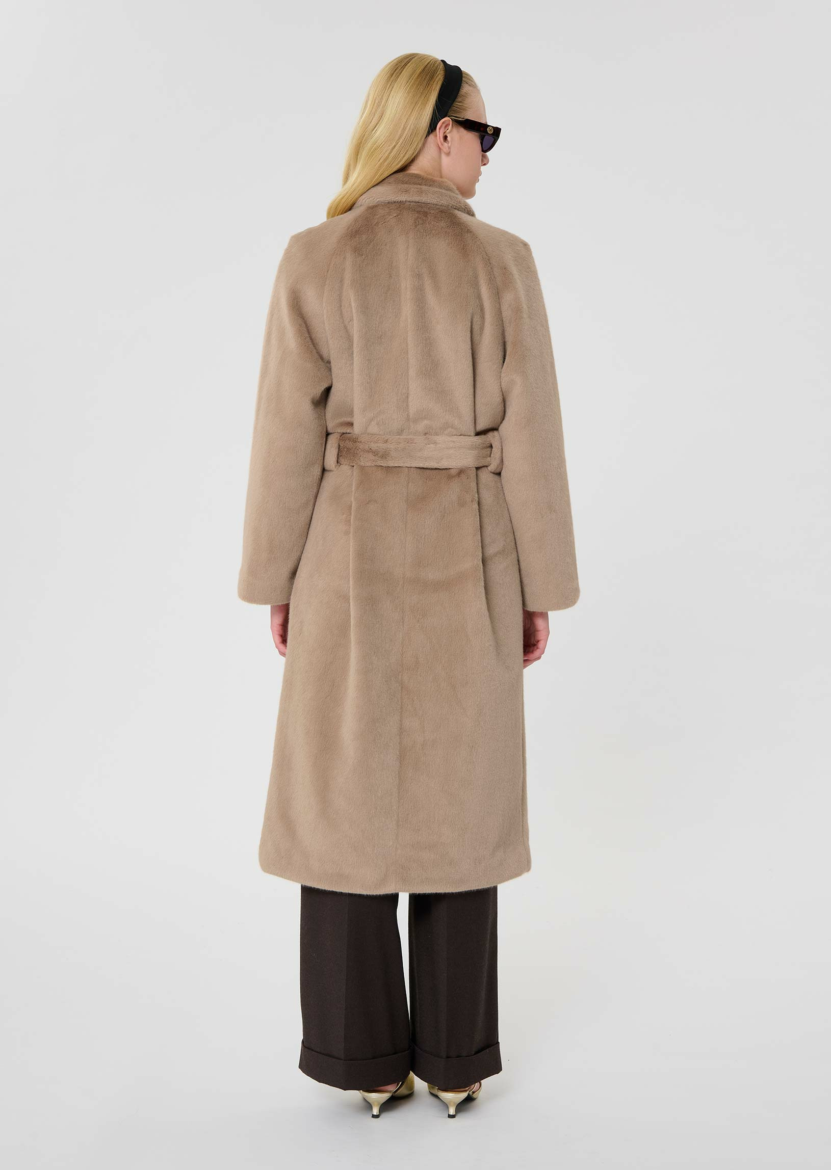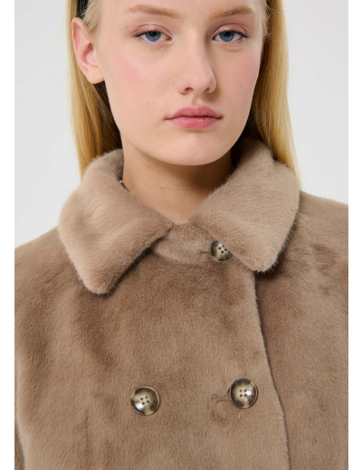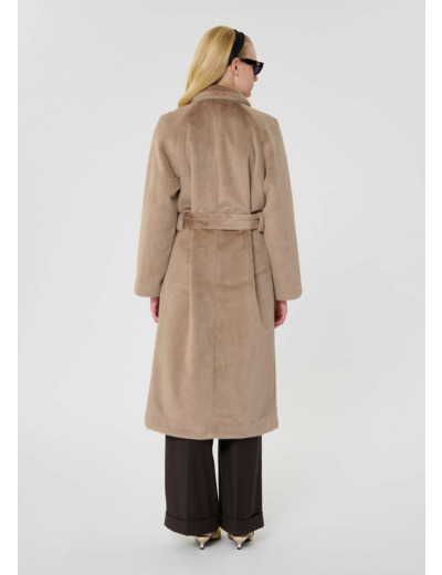 Ce manteau esprit trench couleur noisette en fausse fourrure possède un col à revers, une double patte de boutonnage de boutons verts ainsi qu'une ceinture ton sur ton à la taille pour souligner la silhouette. Ultra original et élégant, il possède également de larges poches aux côtés pour le confort.