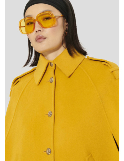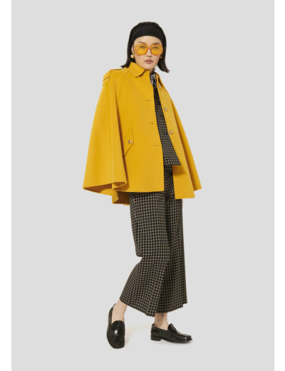Ce manteau cape en drap caban couleur jaune citron possède un col chemise, des pattes de boutonnage aux épaules et deux fentes aux côtés pour pouvoir y passer les bras. Il se ferme au-devant par des boutons dorés, que l'on retrouve également sur les poches à rabats aux côtés.