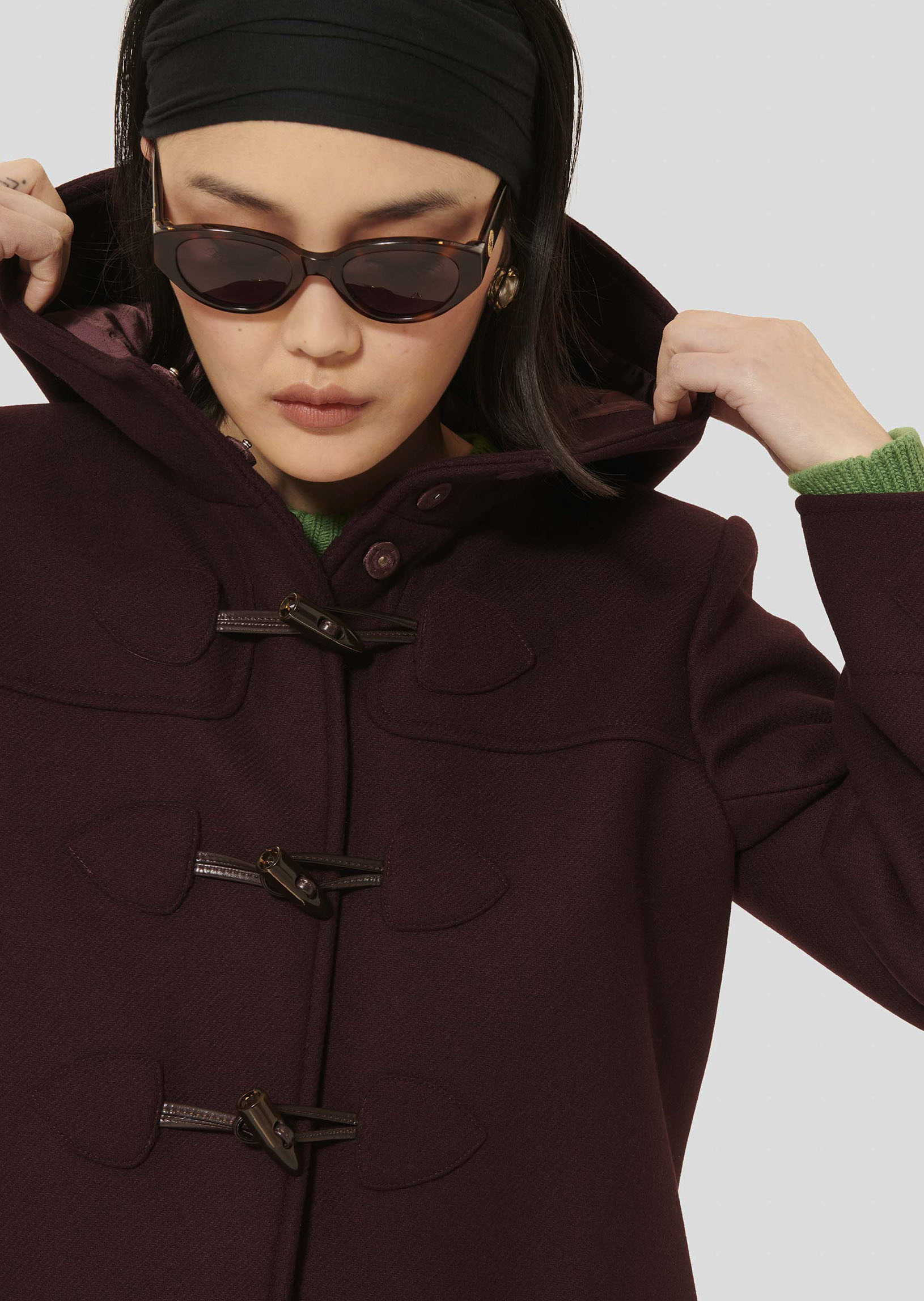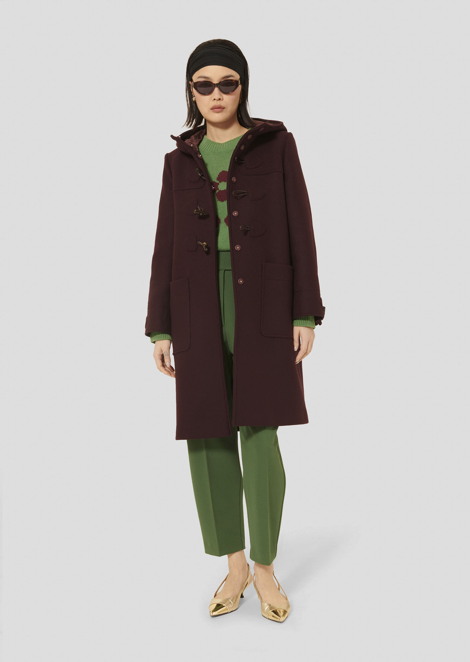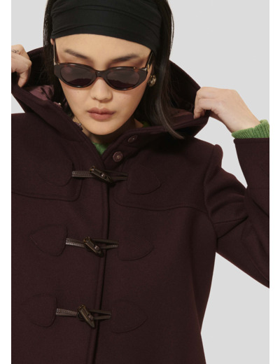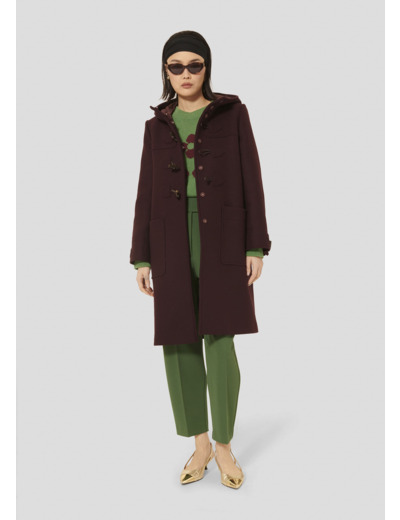 Ce duffle-coat bordeaux en drap caban est caractérisé par ses fermetures brandebourg, sa grande capuche boutonnée au cou, ses pattes de boutonnage aux poignets et ses grandes poches plaquées aux côtés. Le petit détail : ses attaches sont décorées de pierres lumineuses. Il se ferme au-devant par des boutons pressions dissimulés. Ce manteau mi-long sera parfait pour vous tenir bien chaud tout au long de la saison.
