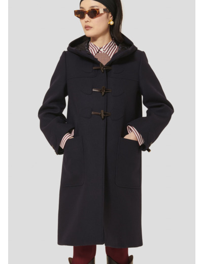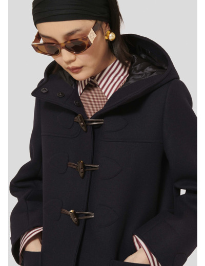 Ce duffle-coat bleu nuit en drap caban est caractérisé par ses fermetures brandebourg, sa grande capuche boutonnée au cou, ses pattes de boutonnage aux poignets et ses grandes poches plaquées aux côtés. Le petit détail : ses attaches sont décorées de pierres lumineuses. Il se ferme au-devant par des boutons pressions dissimulés. Ce manteau mi-long sera parfait pour vous tenir bien chaud tout au long de la saison.