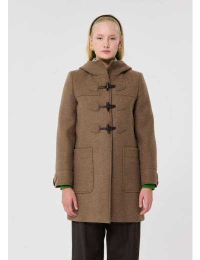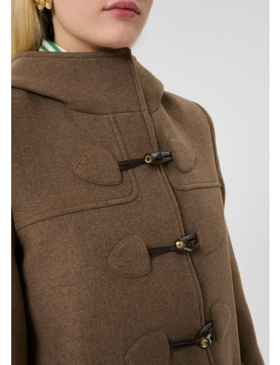 Ce duffle-coat couleur noisette en drap caban est caractérisé par ses fermetures brandebourg, sa grande capuche boutonnée au cou, ses pattes de boutonnage aux poignets et ses grandes poches plaquées aux côtés. Le petit détail : ses attaches en écaille sont décorées de pierres lumineuses. Ce manteau mi-long sera parfait pour vous tenir bien chaud tout au long de la saison.
