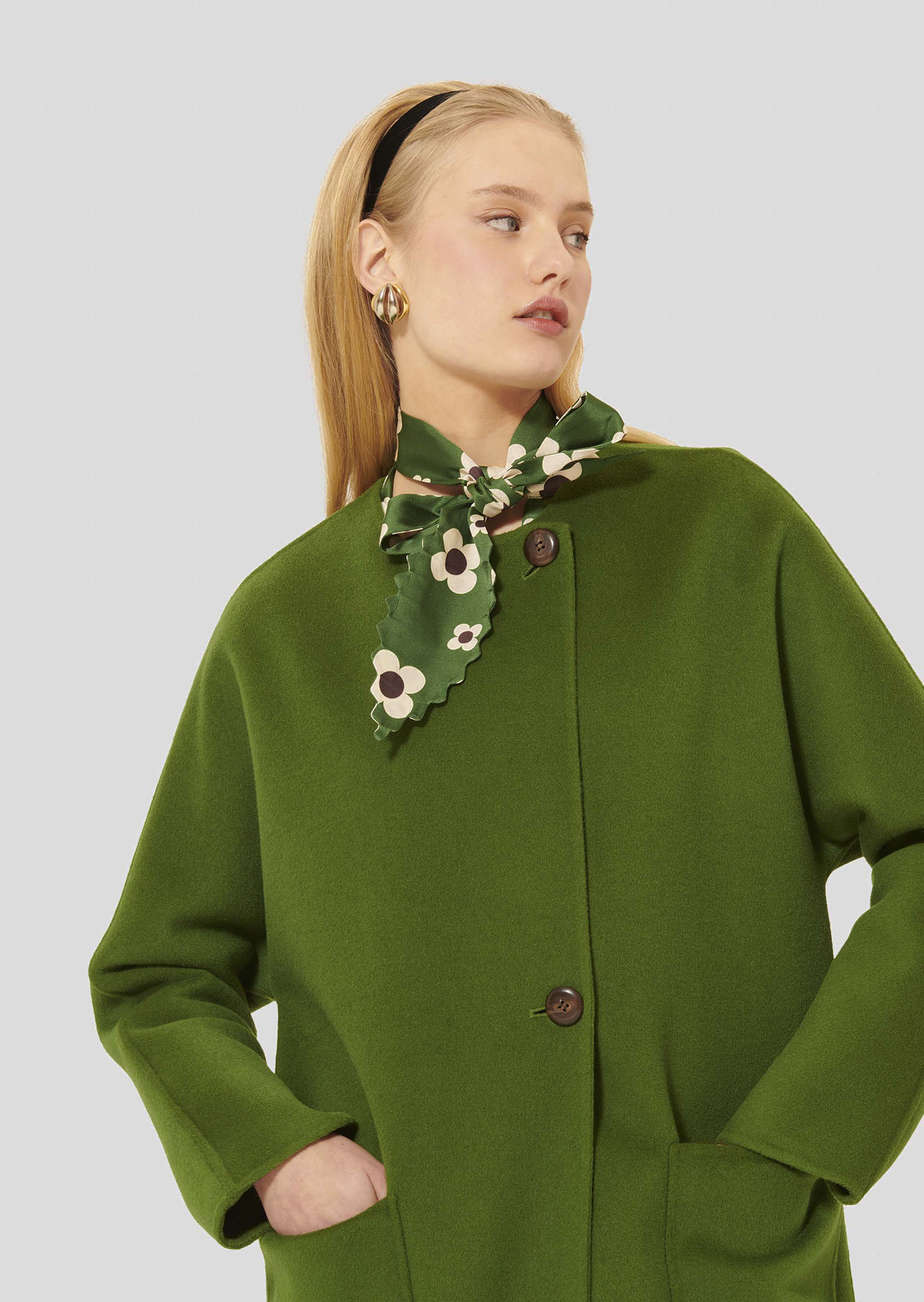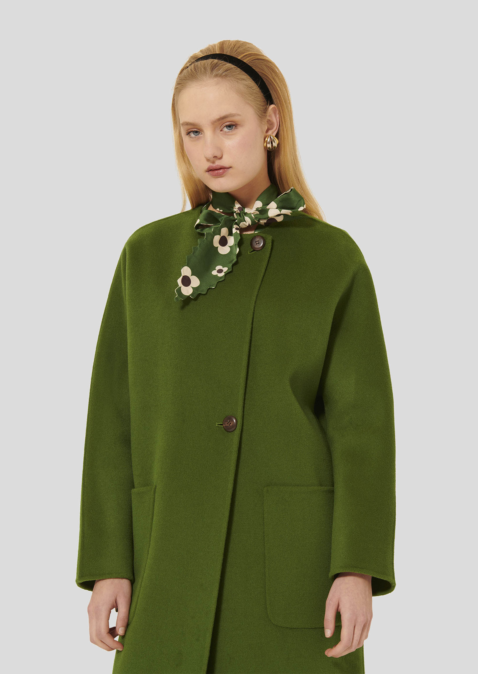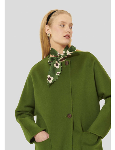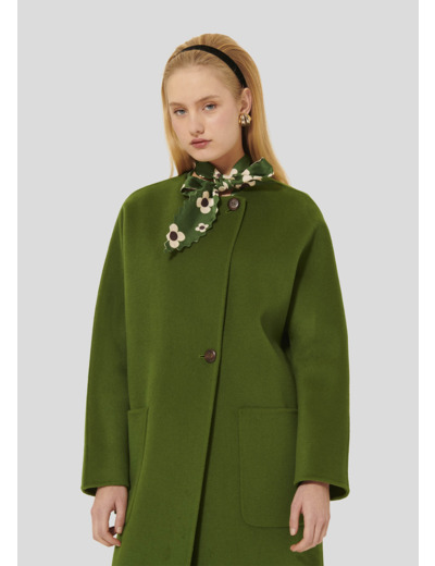 Ce long manteau couleur cactus en laine double face possède une encolure ronde, des manches longues et deux grandes poches plaquées aux côtés. Sa fermeture est asymétrique, grâce à deux gros boutons marron.