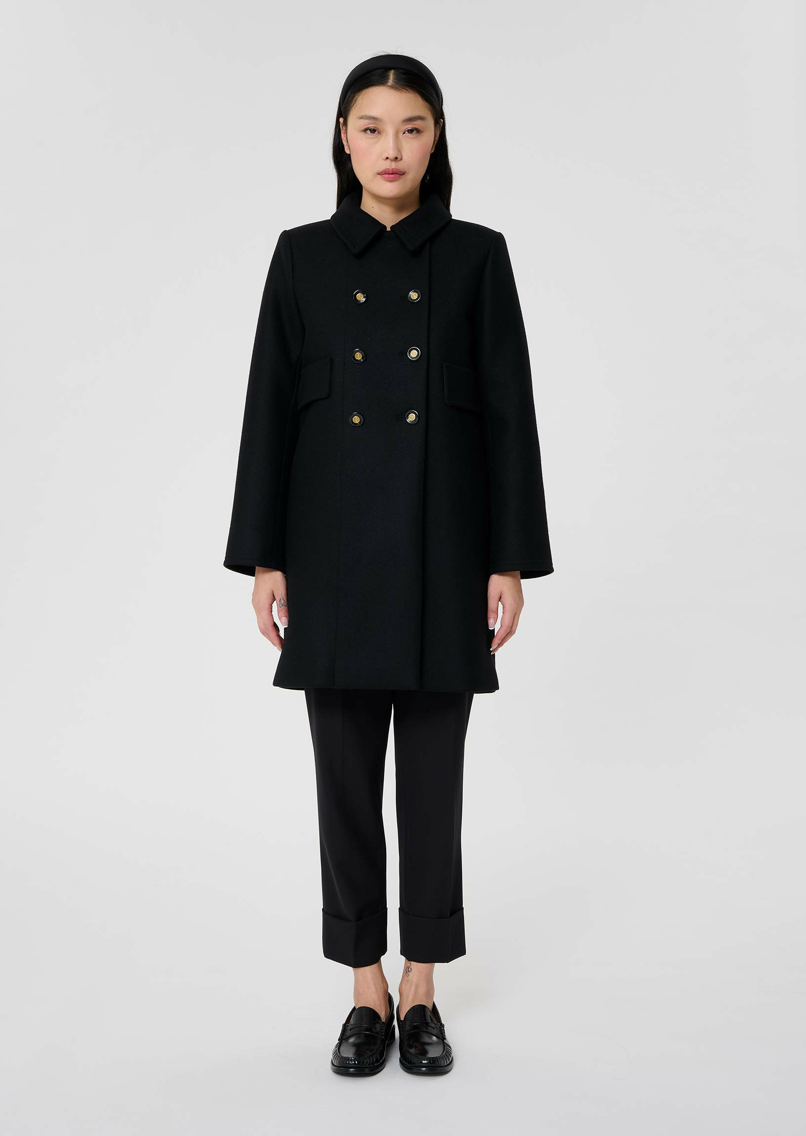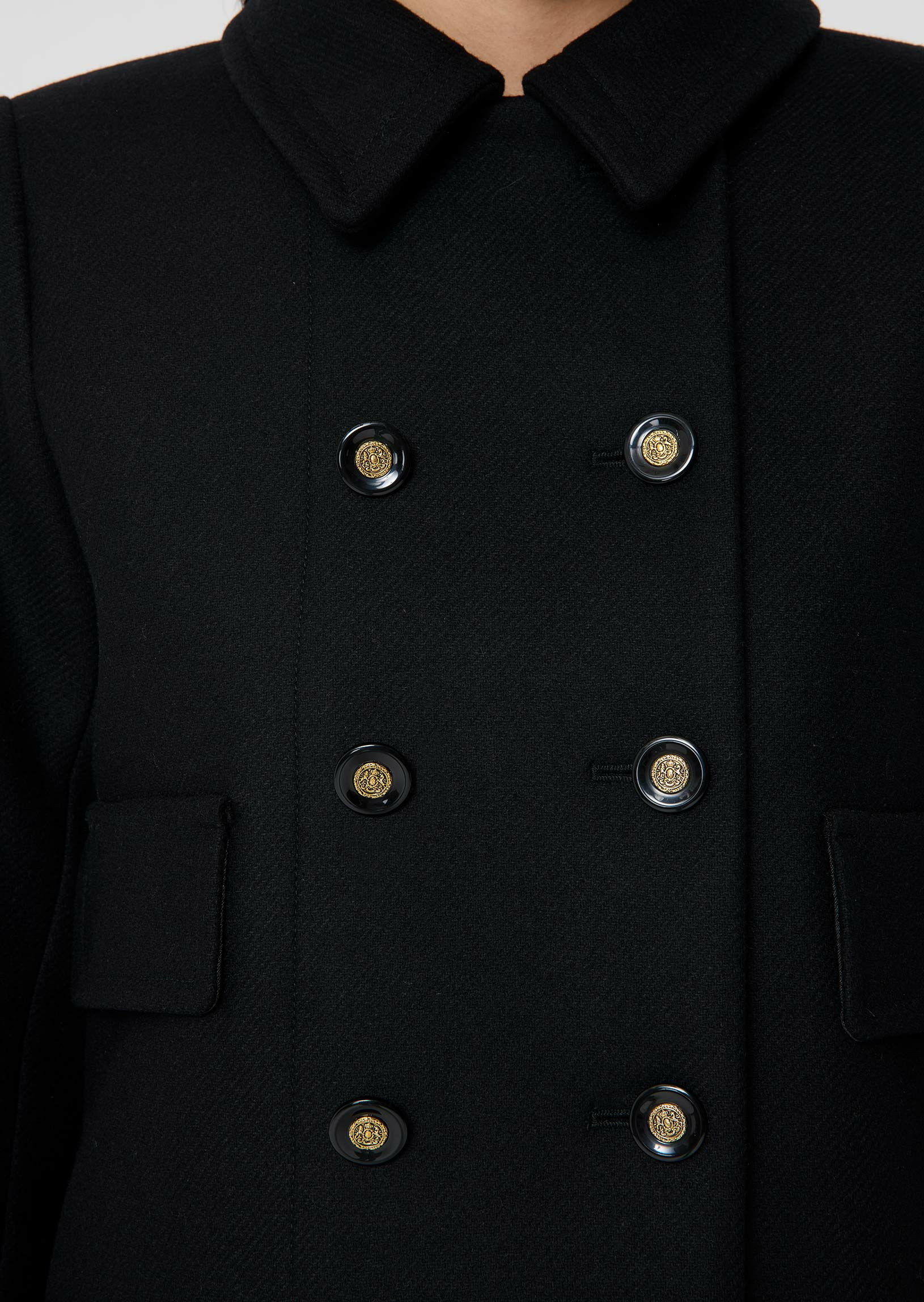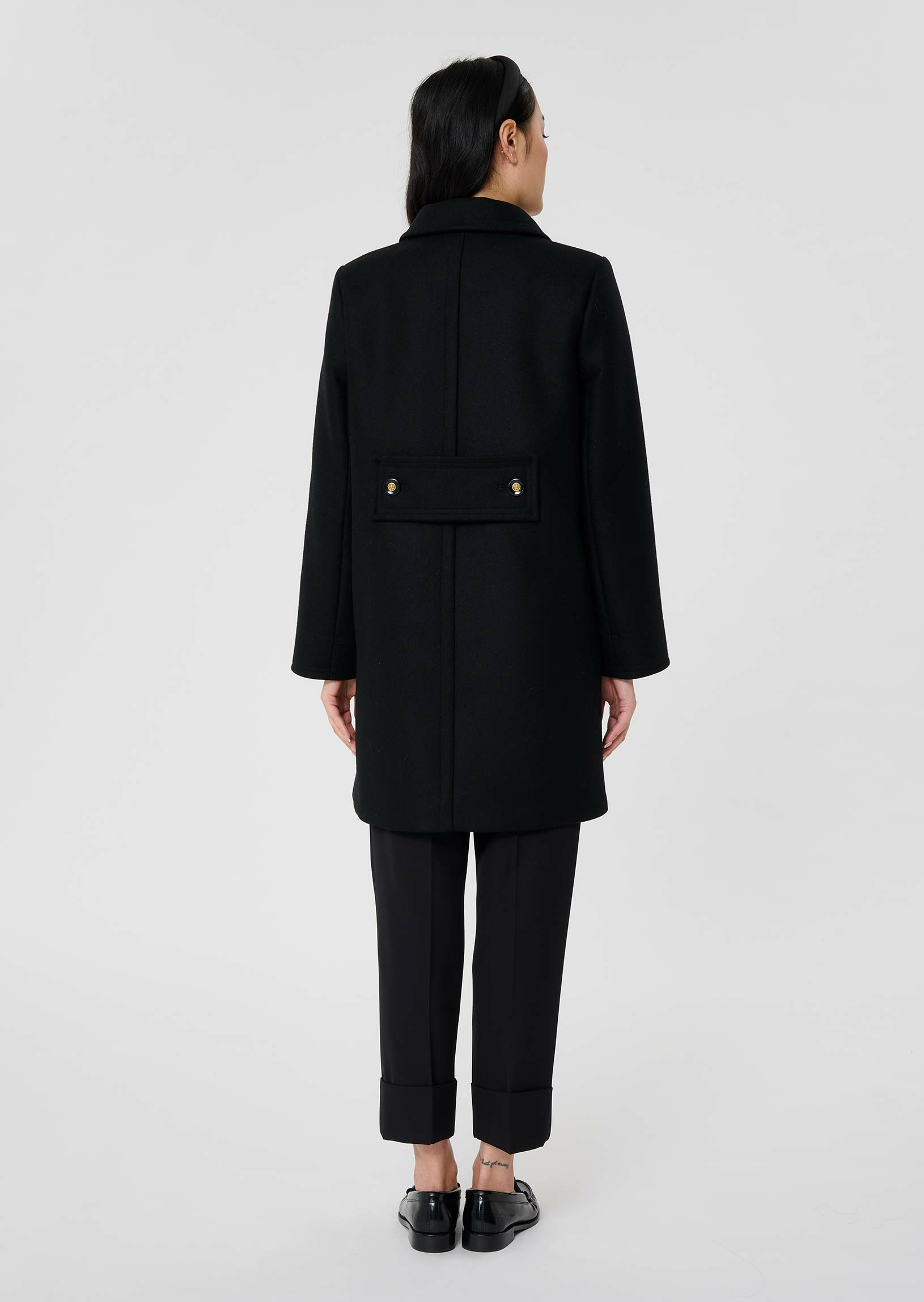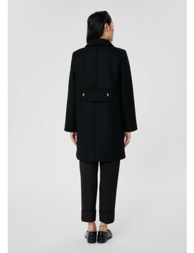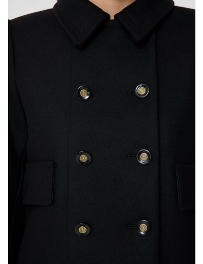 Ce manteau mi-long en drap caban noir possède un col chemise et deux grandes poches à rabats aux côtés. Il se ferme grâce à un double boutonnage de boutons noirs et dorés.
