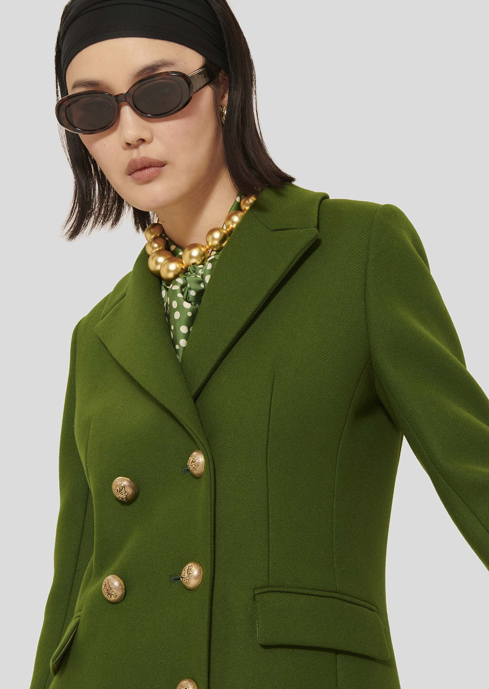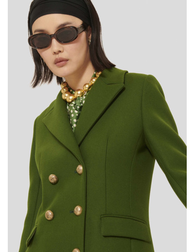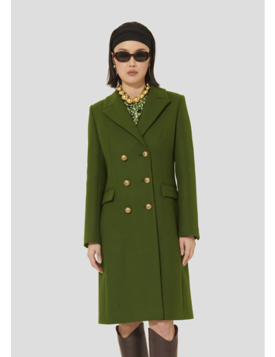 Ce long manteau couleur cactus en drap caban possède une coupe légèrement cintrée à la taille, un large col à revers, de longues manches boutonnées aux poignets et deux poches à rabats aux côtés. Il se ferme par un triple boutonnage de boutons dorés.