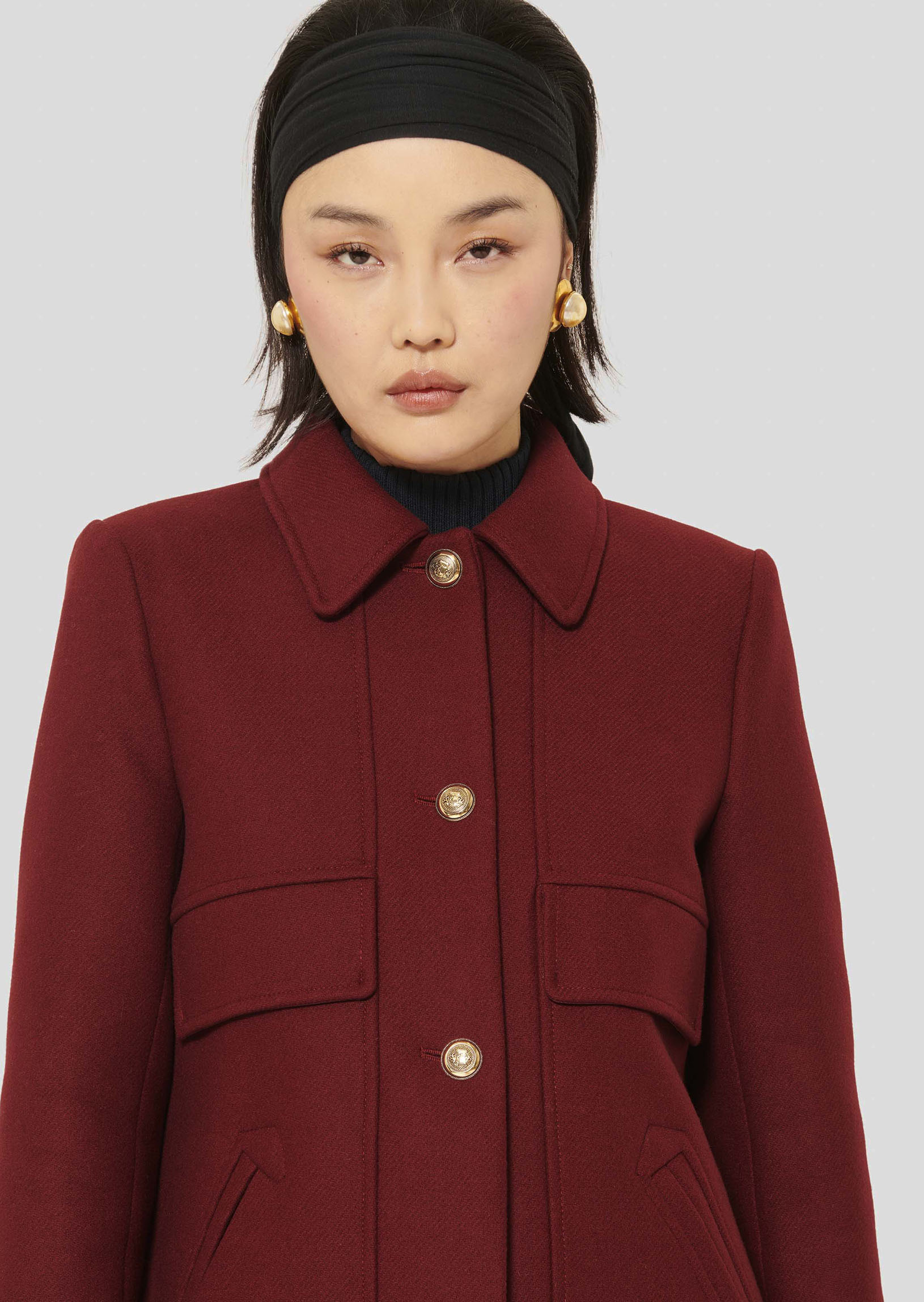 Ce manteau mi-long bordeaux en drap caban possède un col chemise, des manches longues et deux poches passepoilées aux côtés. Il se ferme au-devant par deux boutons pression dissimulés et trois jolis boutons dorés.