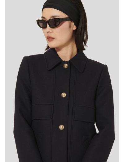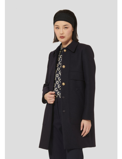 Ce manteau mi-long bleu nuit en drap caban possède un col chemise, des manches longues et deux poches passepoilées aux côtés. Il se ferme au-devant par deux boutons pression dissimulés et trois jolis boutons dorés.