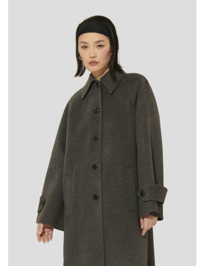 Manteau gris en laine 80% et nylon 20%. Entretien : ne pas laver, ne pas blanchir, séchage en tambour interdit, repassage doux à 110°C maximum, nettoyage à sec délicat.
