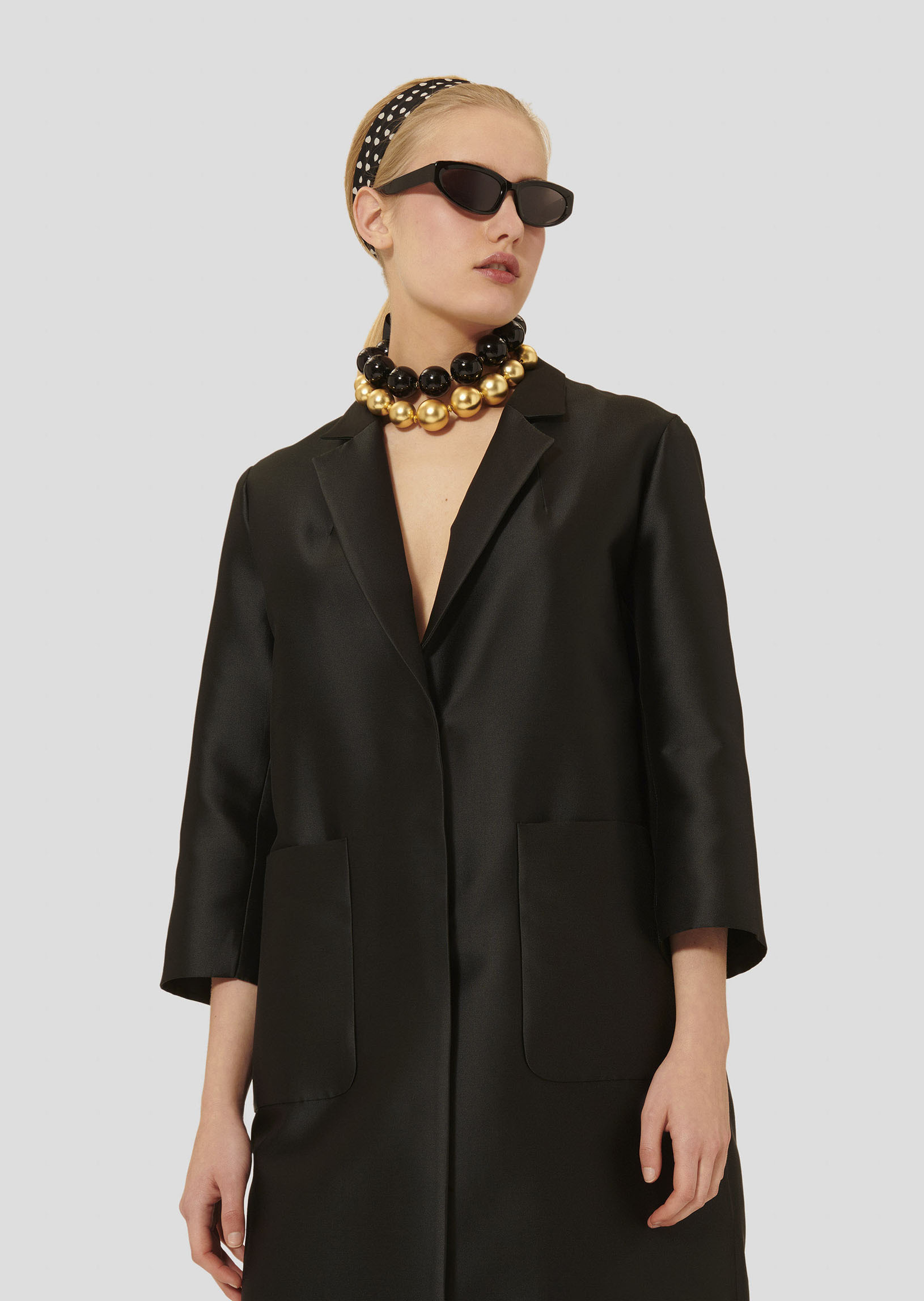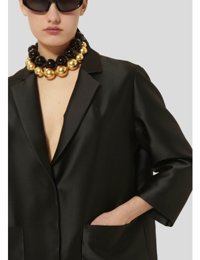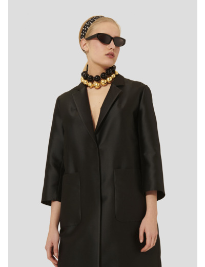 Ce long manteau noir en satin duchesse possède une coupe droite et large, un col à revers, des manches 3/4 et deux grandes poches plaquées aux côtés. Il se ferme au-devant par des boutons pression dissimulés.