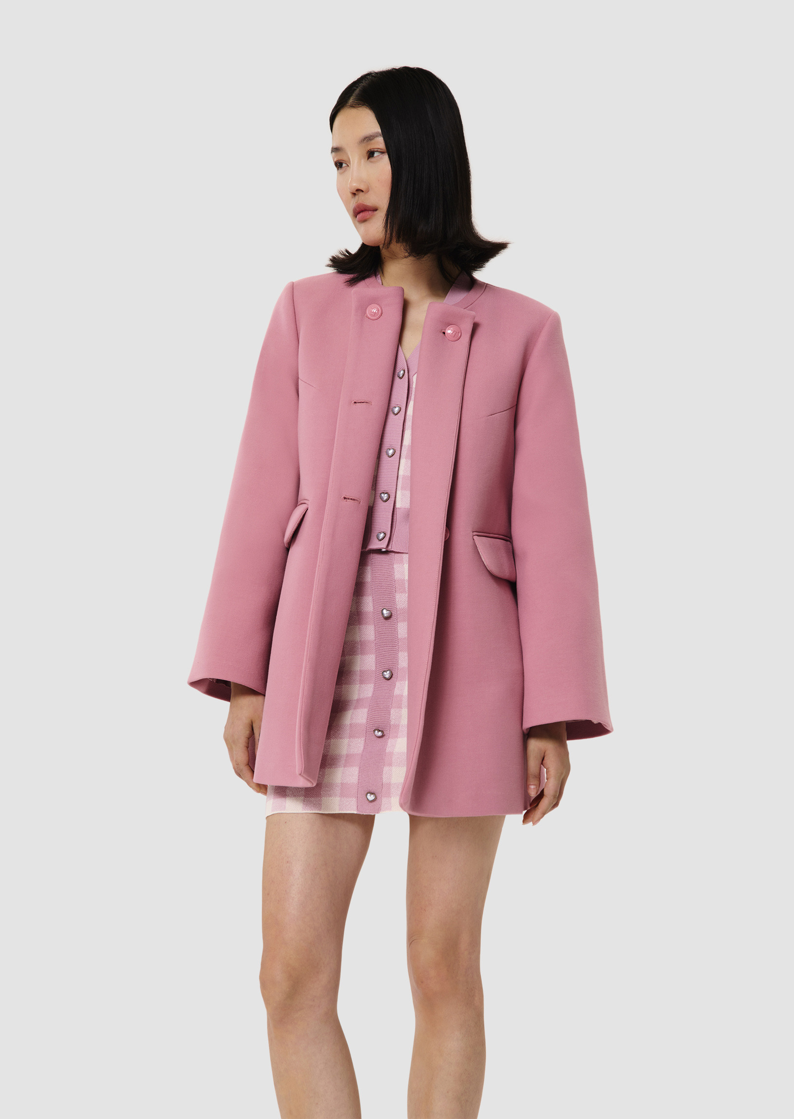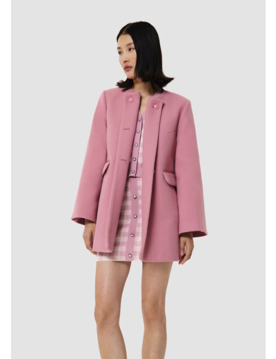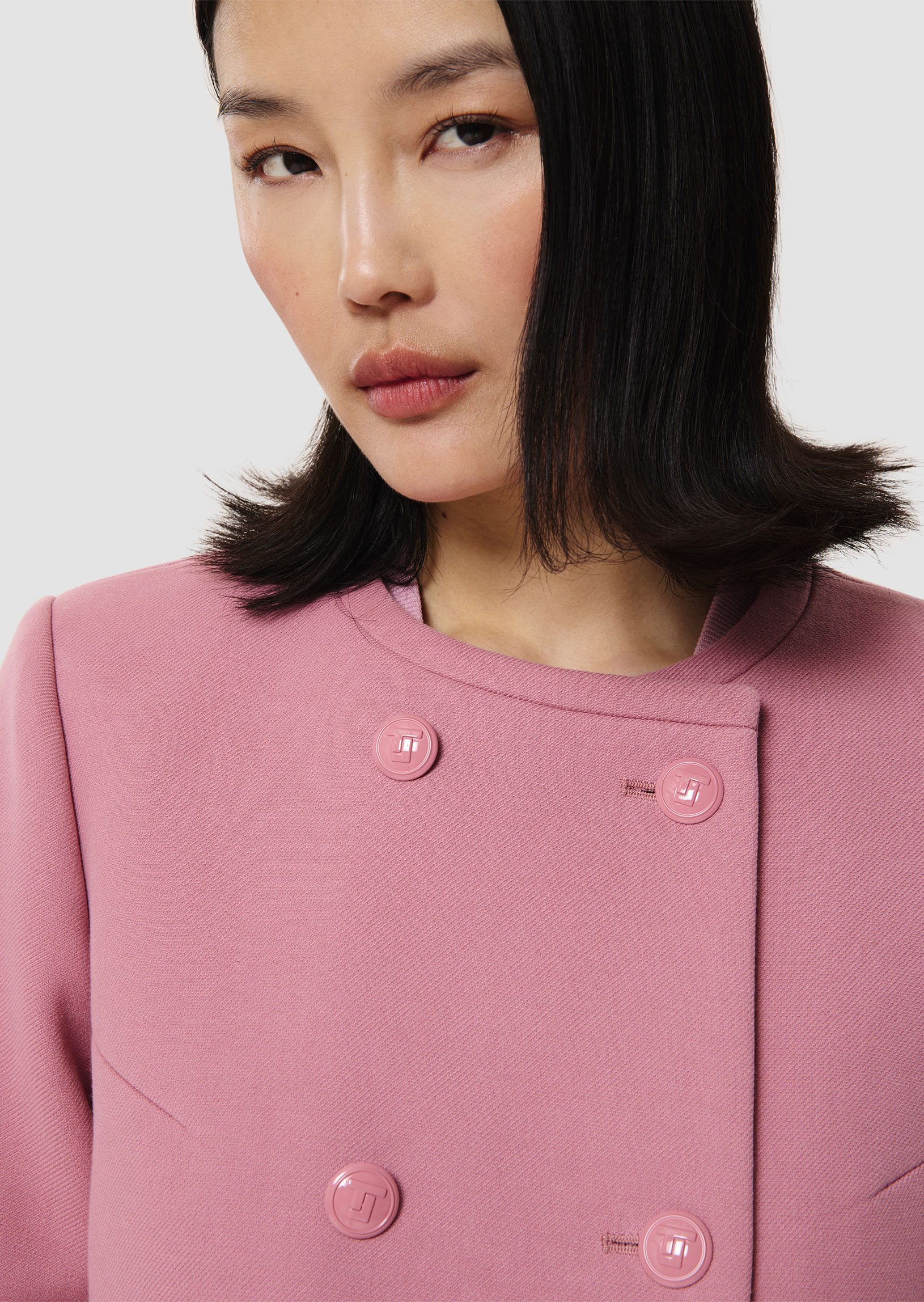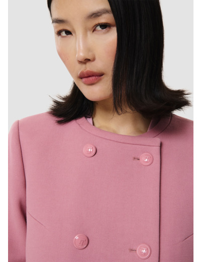 Ce manteau court en double coton couleur bois de rose possède une encolure ronde et des manches longues légèrement évasées. Il se ferme grâce à un double boutonnage de boutons ton sur ton décorés au monogramme de la maison et possède des poches à rabat au côté.