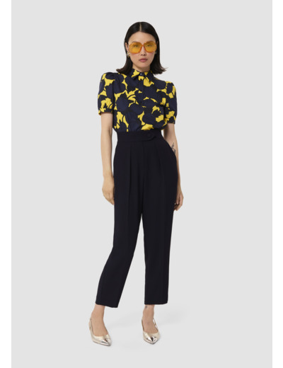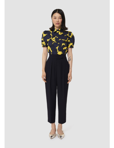 Ce pantalon bleu nuit en crêpe possède une coupe carotte7/8 ème, une taille ultra-haute, une jambe droite 7/8ème avec un pli plat au devant, de grandes poches italiennes aux côtés et des poches passepoilées au dos. Il a une ceinture à bout pointu et se ferme grâce à un bouton recouvert, un zip et une agrafe.