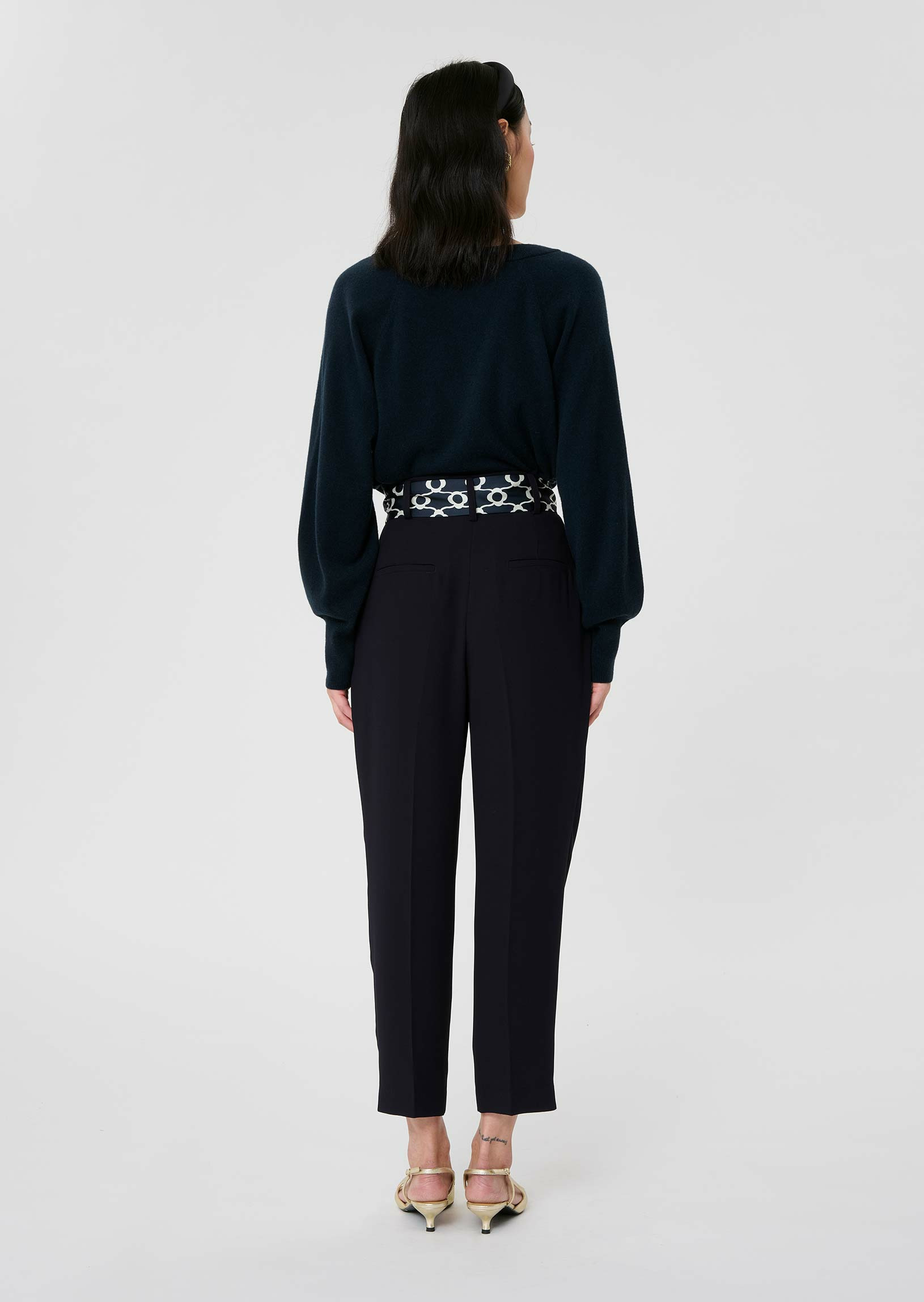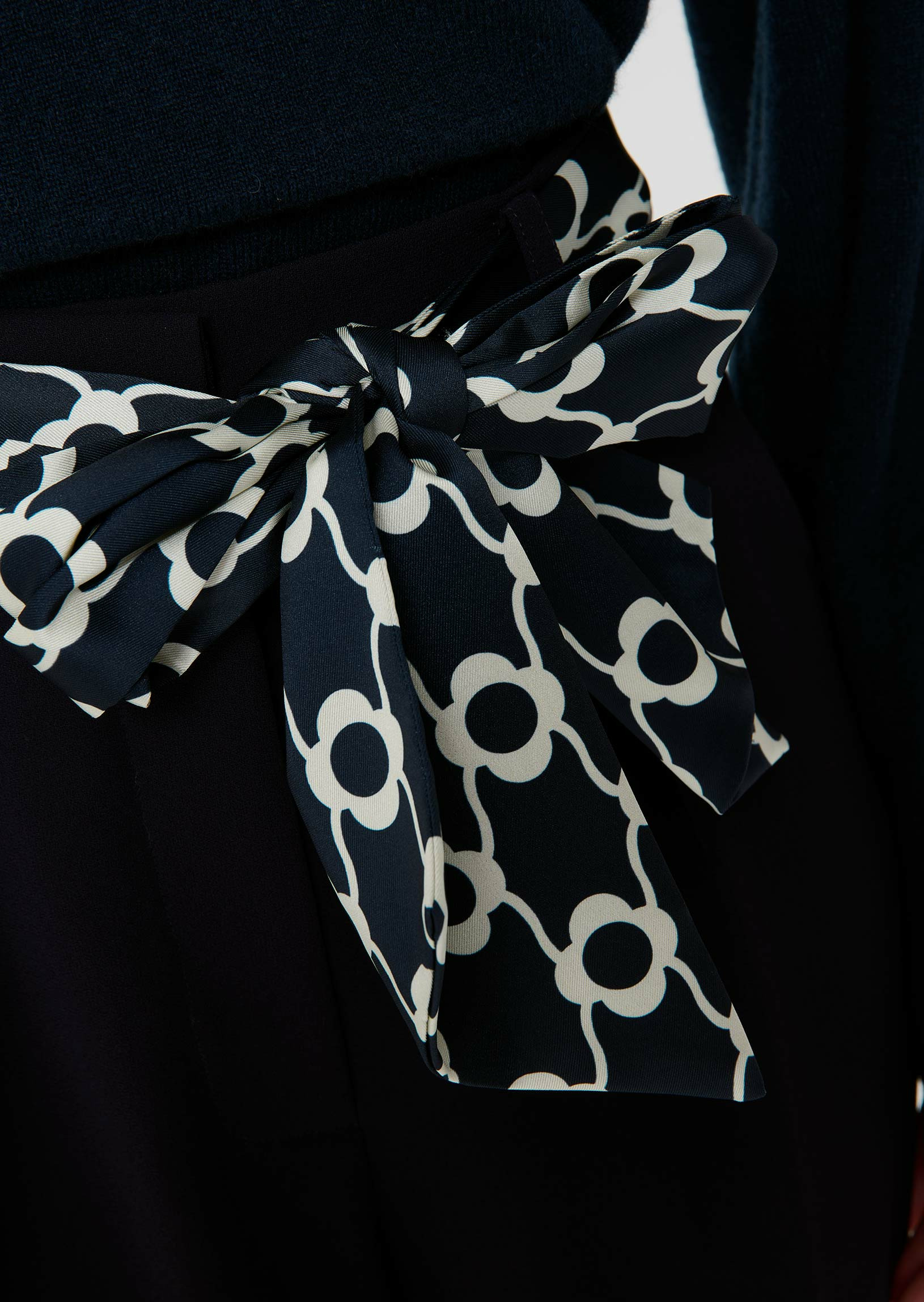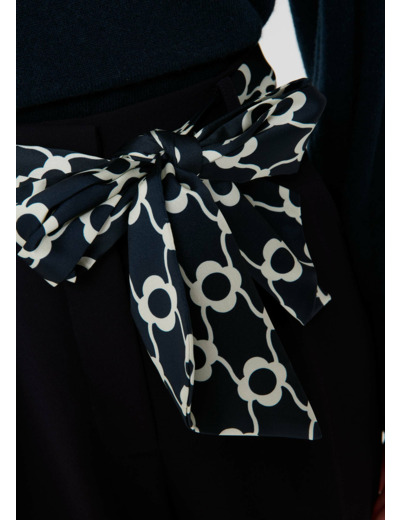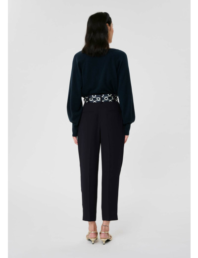 Ce pantalon bleu nuit en crêpe possède une coupe ajustée et une ceinture foulard amovible bleu nuit à fleurs écrues. Il possède deux poches aux côtés ainsi que deux poches passepoilées au dos. Fermeture classique par un zip et une agrafe.
