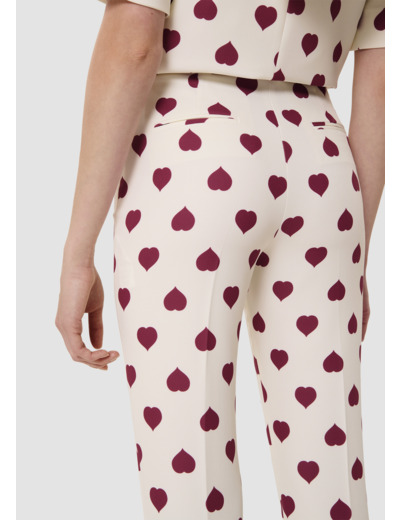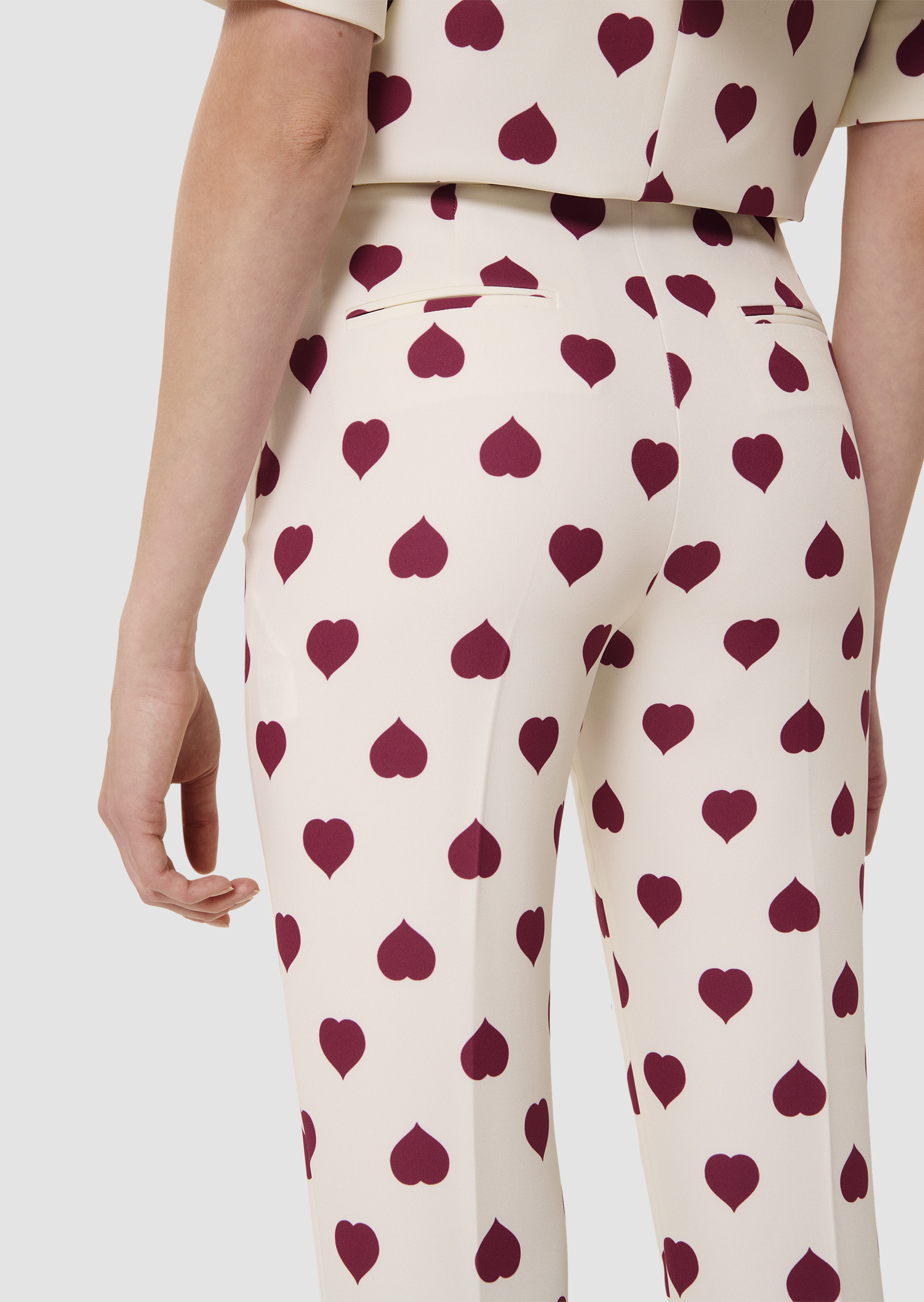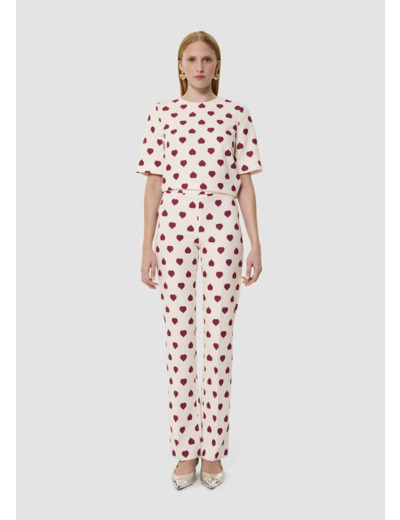 Ce pantalon a une taille mi-haute, une coupe droite et des poches passepoilées au dos. Sa matière stretch épouse la silhouette pour la sublimer. Il est entièrement imprimé de notre motif polka heart rose sur fond blanc craie. Fermeture par zip invisible au côté.