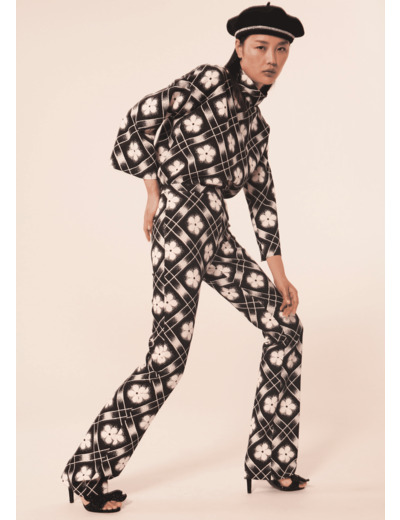 Ce pantalon a une coupe longue légèrement évasée au bas, une taille mi-haute et des poches passepoilées au dos. Sa matière stretch épouse la silhouette pour la sublimer. Il est entièrement imprimé de notre motif maxi daisy blanc sur fond noir. Fermeture par zip invisible au côté.