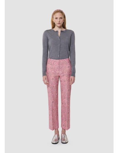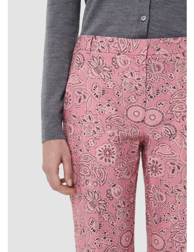 Ce pantalon de tailleur imprimé de notre motif bandana couleur bois de rose possède une taille mi-haute, une coupe 7/8ème et une jambe droite marquée de plis plats. Il a des poches italiennes aux cotés et deux poches passepoilées à l'arrière. Fermeture à l'avant par un zip et une agrafe.