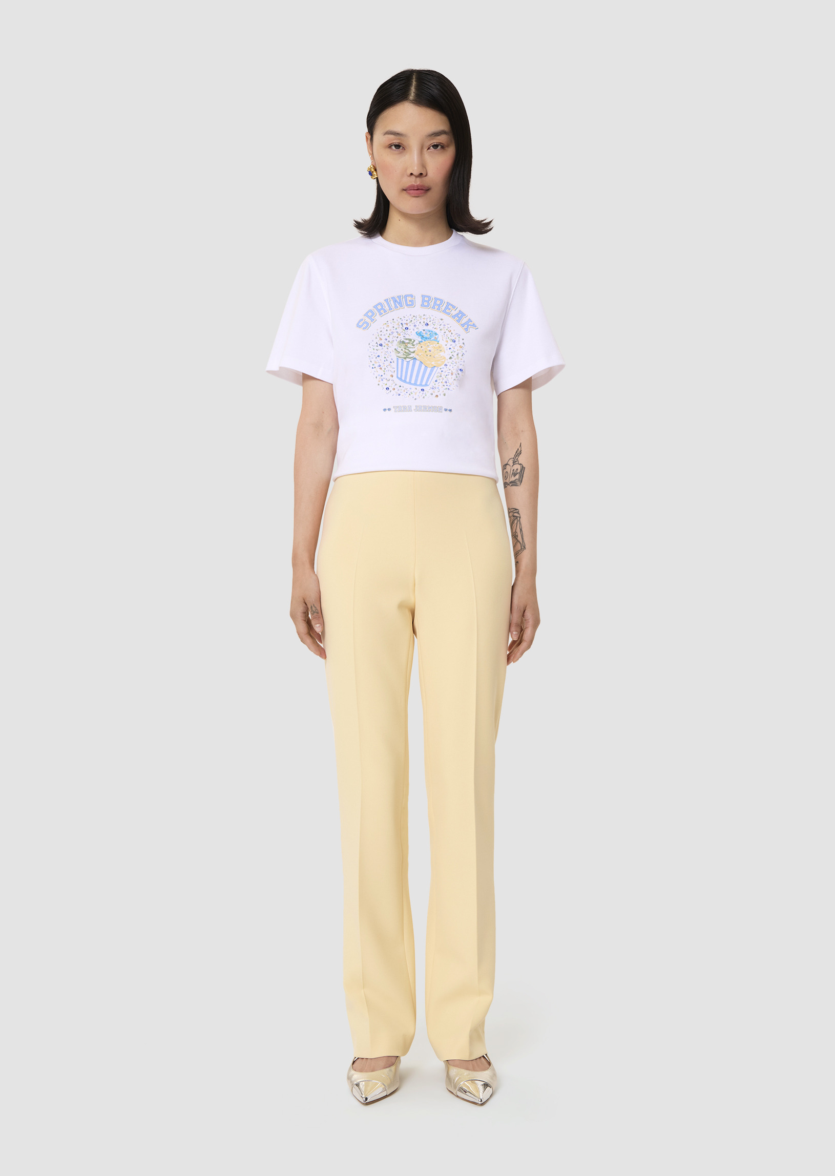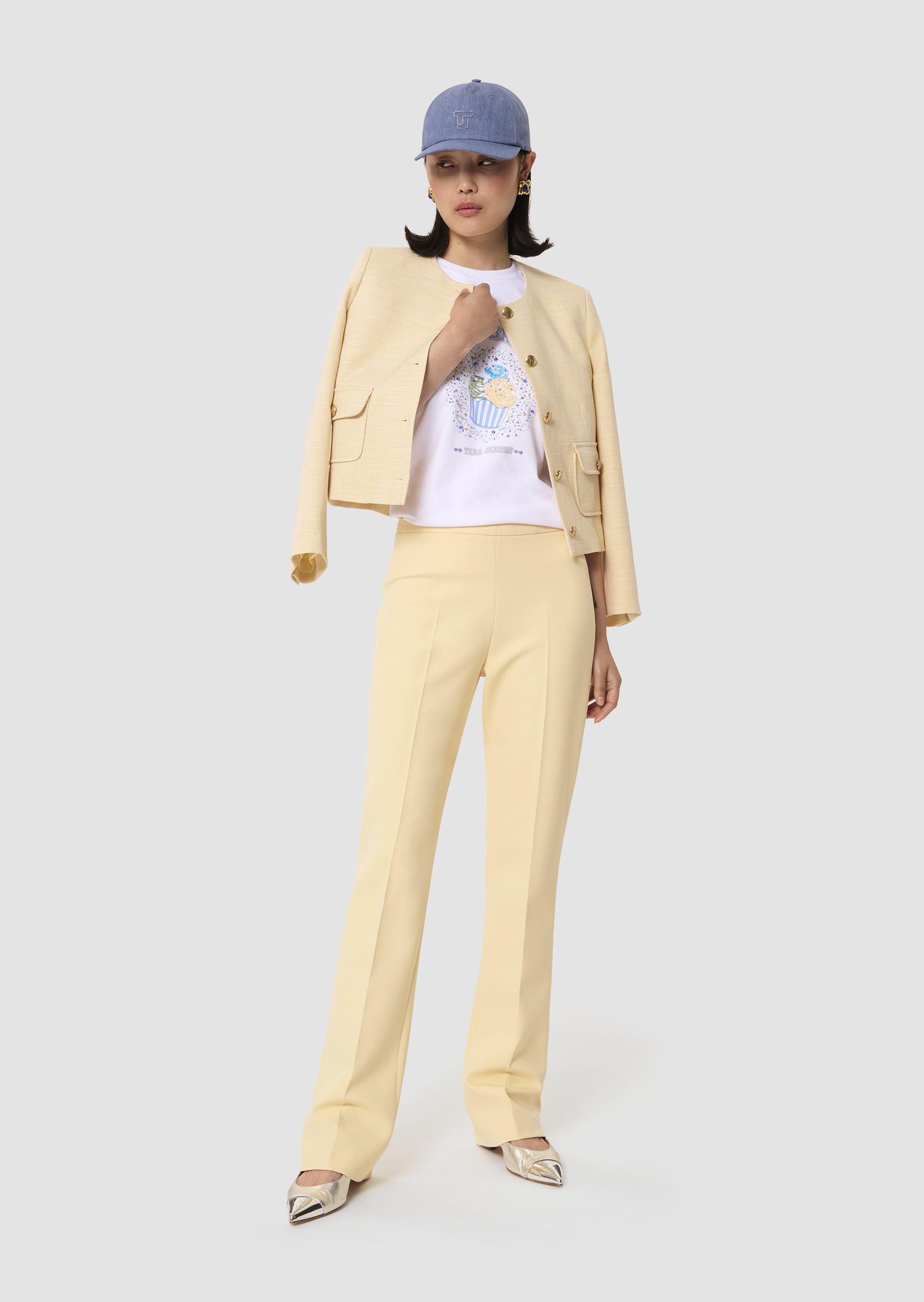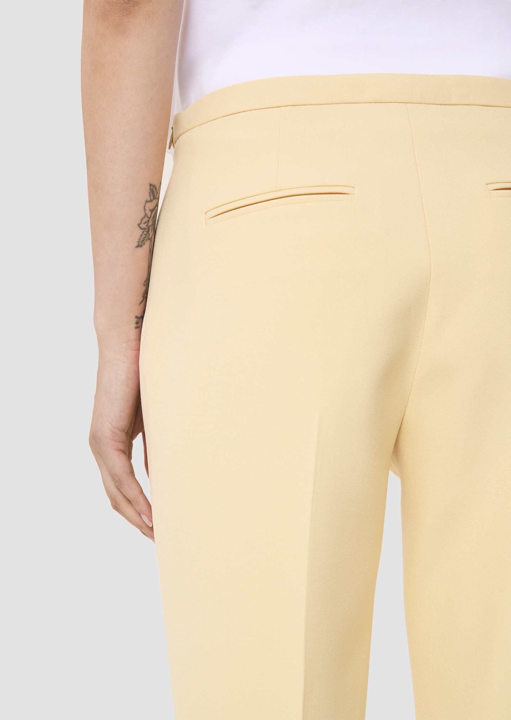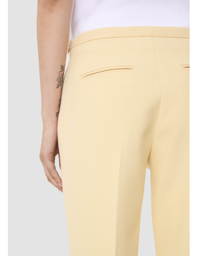 Ce pantalon couleur jaune vanille en toile double a une coupe droite ajustée, une taille mi-haute et des poches passepoilées au dos. Il se ferme au-côté par un zip invisible.