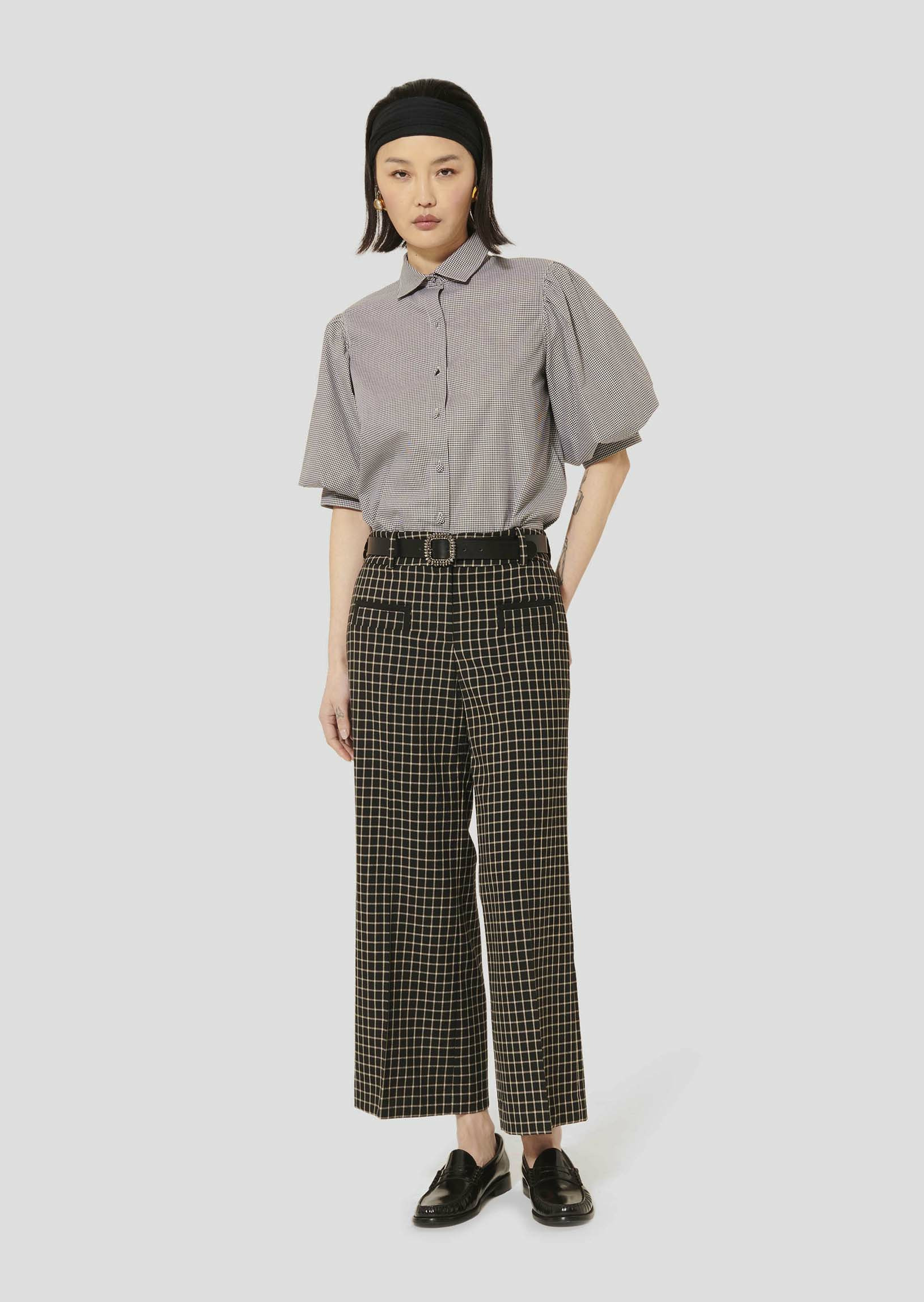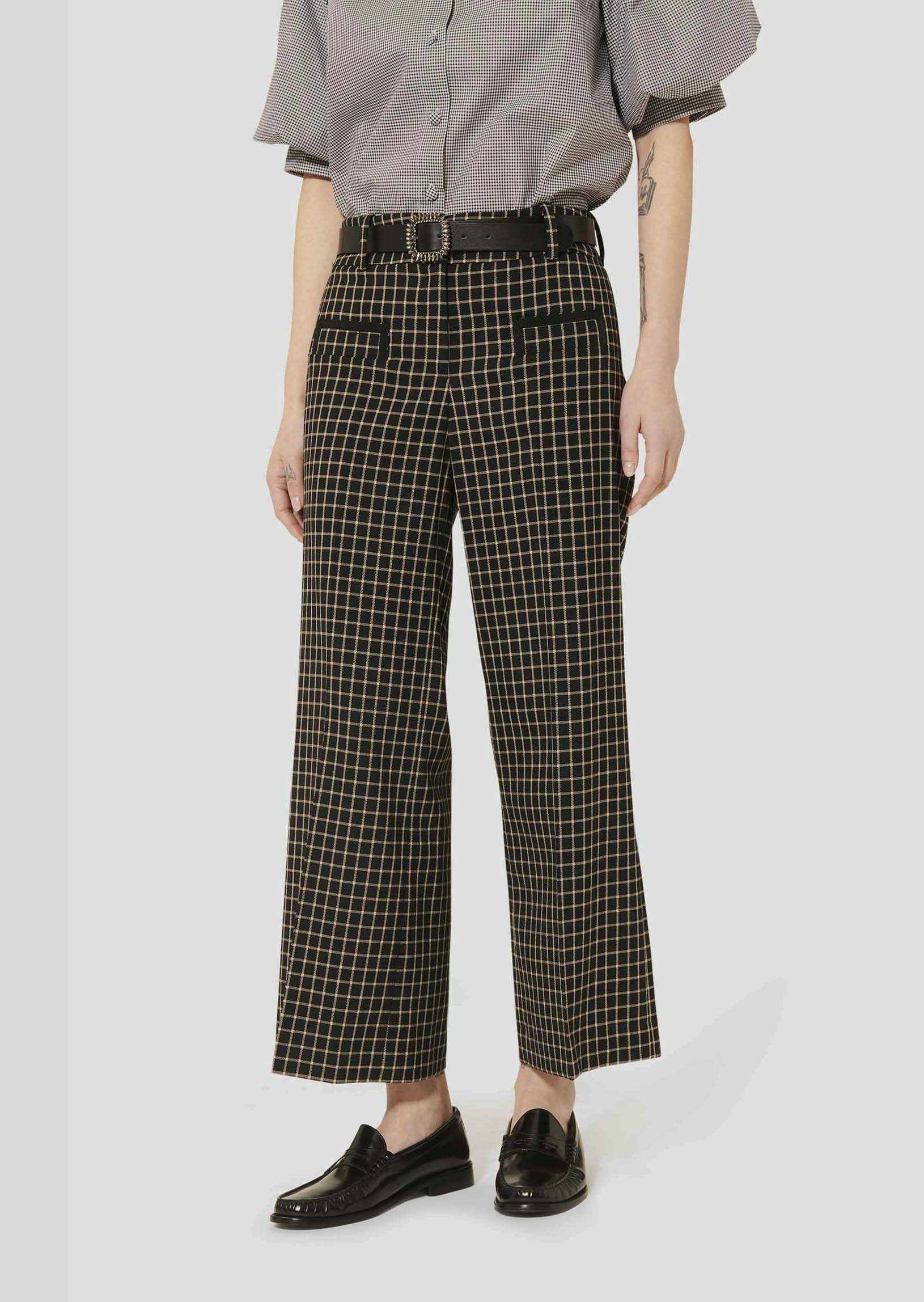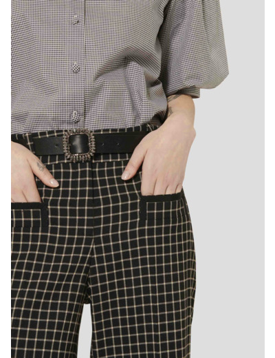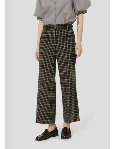 Ce pantalon noir à carreaux possède une taille mi-haute, une coupe large, un pli plat et deux poches passepoilées aux côtés. On le porte avec la veste Vannie assortie pour un total look élégant.