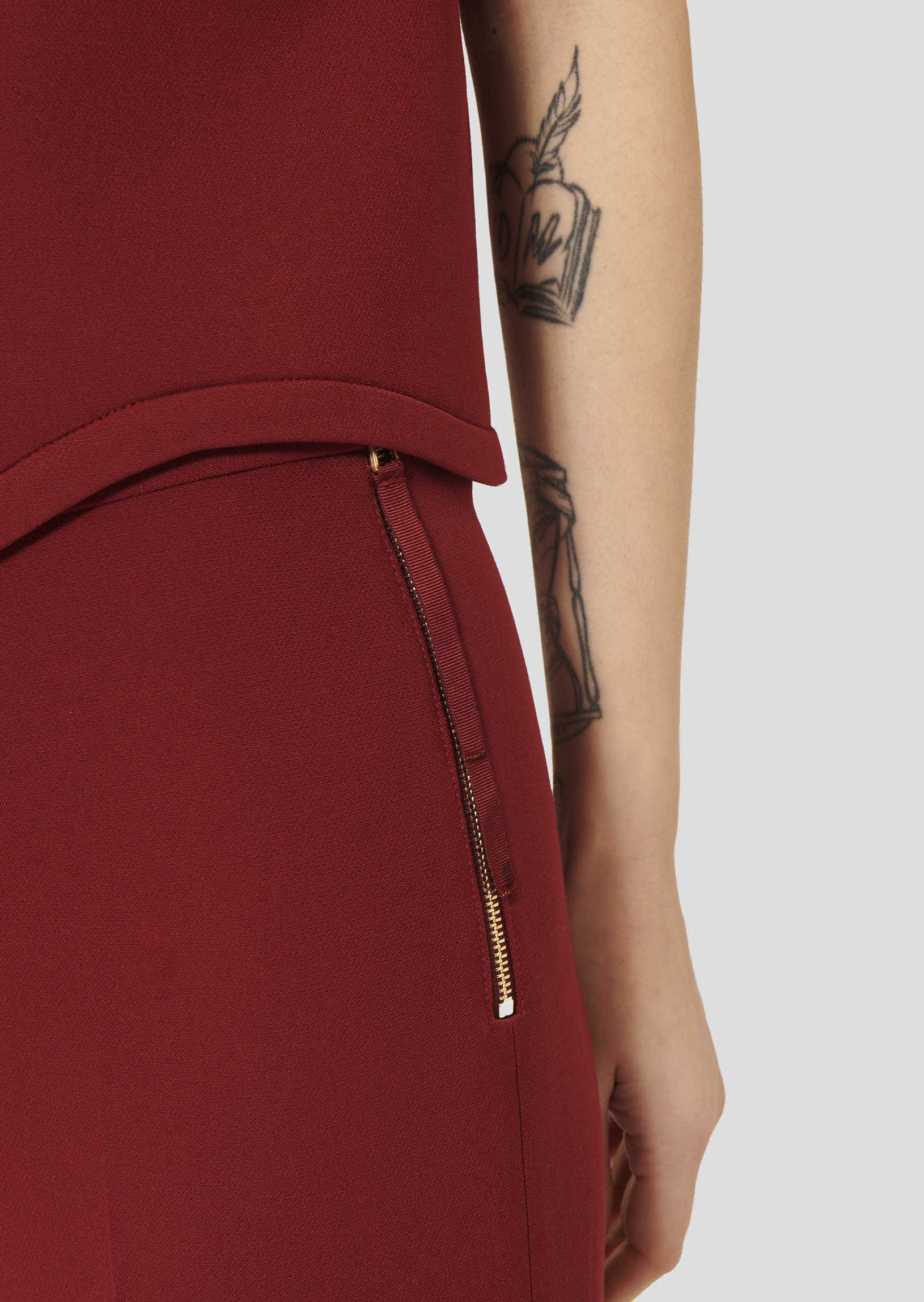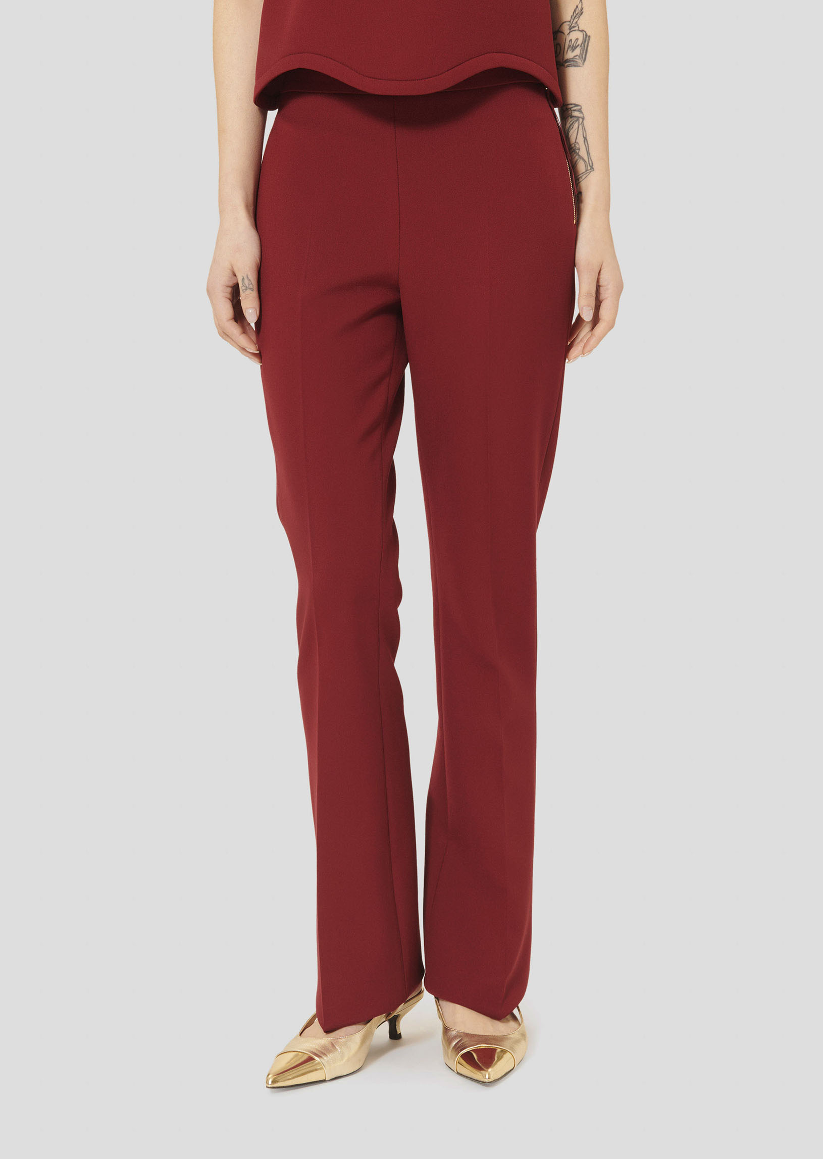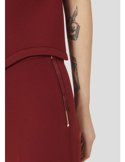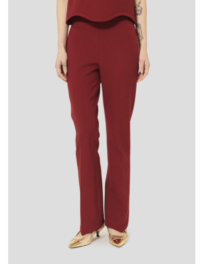 Ce pantalon bordeaux en toile double stretch a une taille mi-haute et une coupe près du corps qui épouse la silhouette pour la sublimer. Il se ferme par un zip doré sur le côté, grâce à un petit ruban ton sur ton.