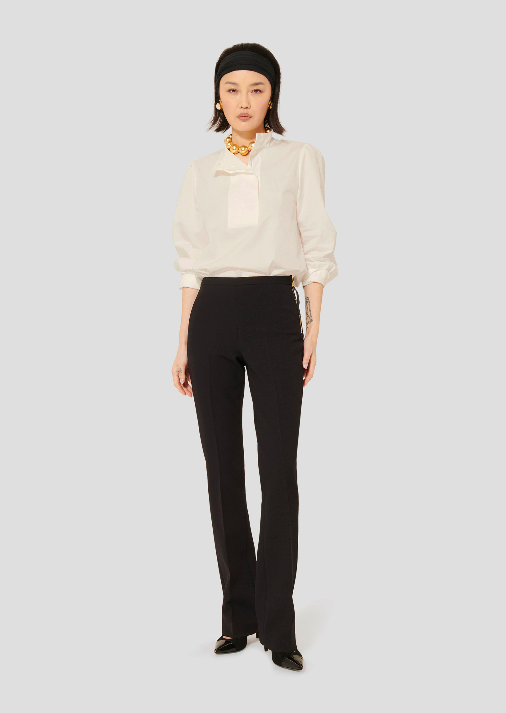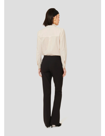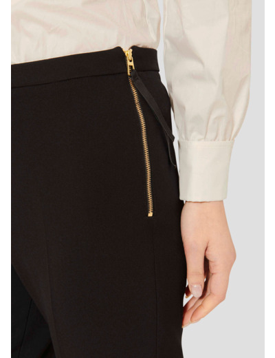 Ce pantalon noir en toile double stretch a une taille mi-haute et une coupe près du corps qui épouse la silhouette pour la sublimer. Il se ferme par un zip doré sur le côté, grâce à un petit ruban ton sur ton.