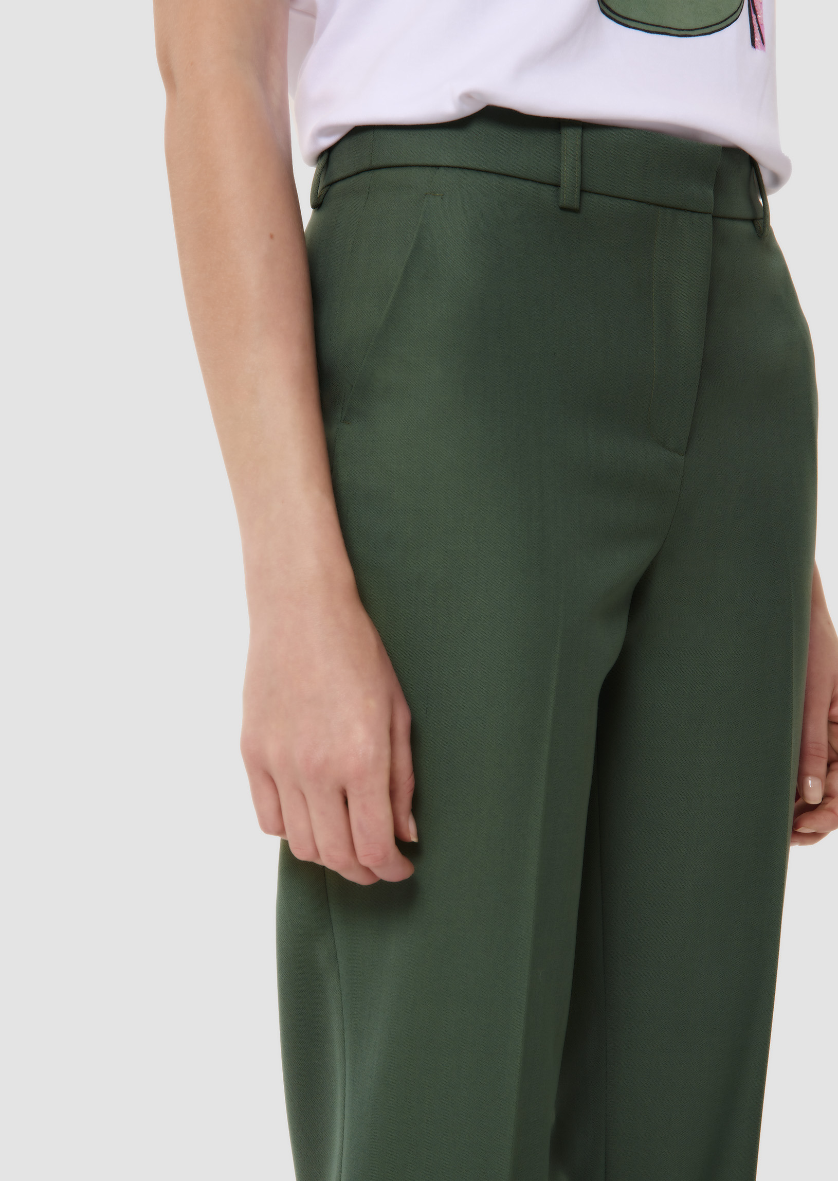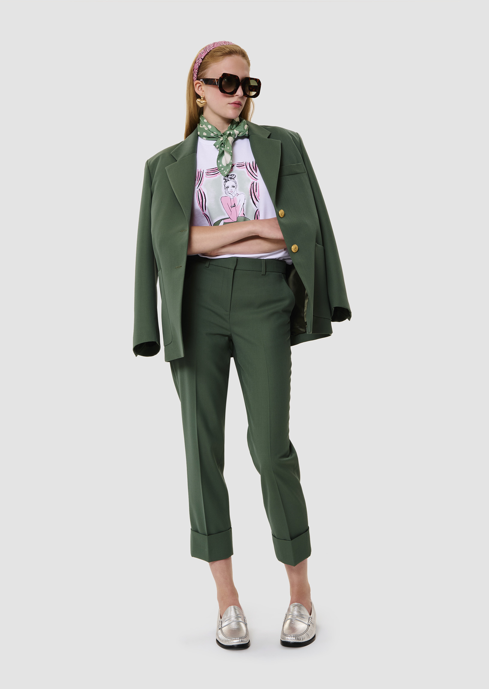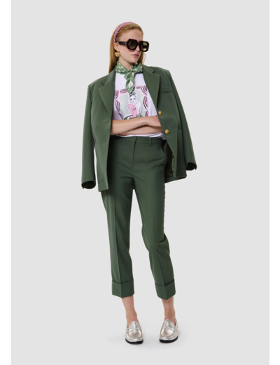 Basique de la garde robe, ce pantalon de tailleur en laine couleur vert possède une taille haute et une jambe droite soulignée d'un large revers et d'un pli plat.