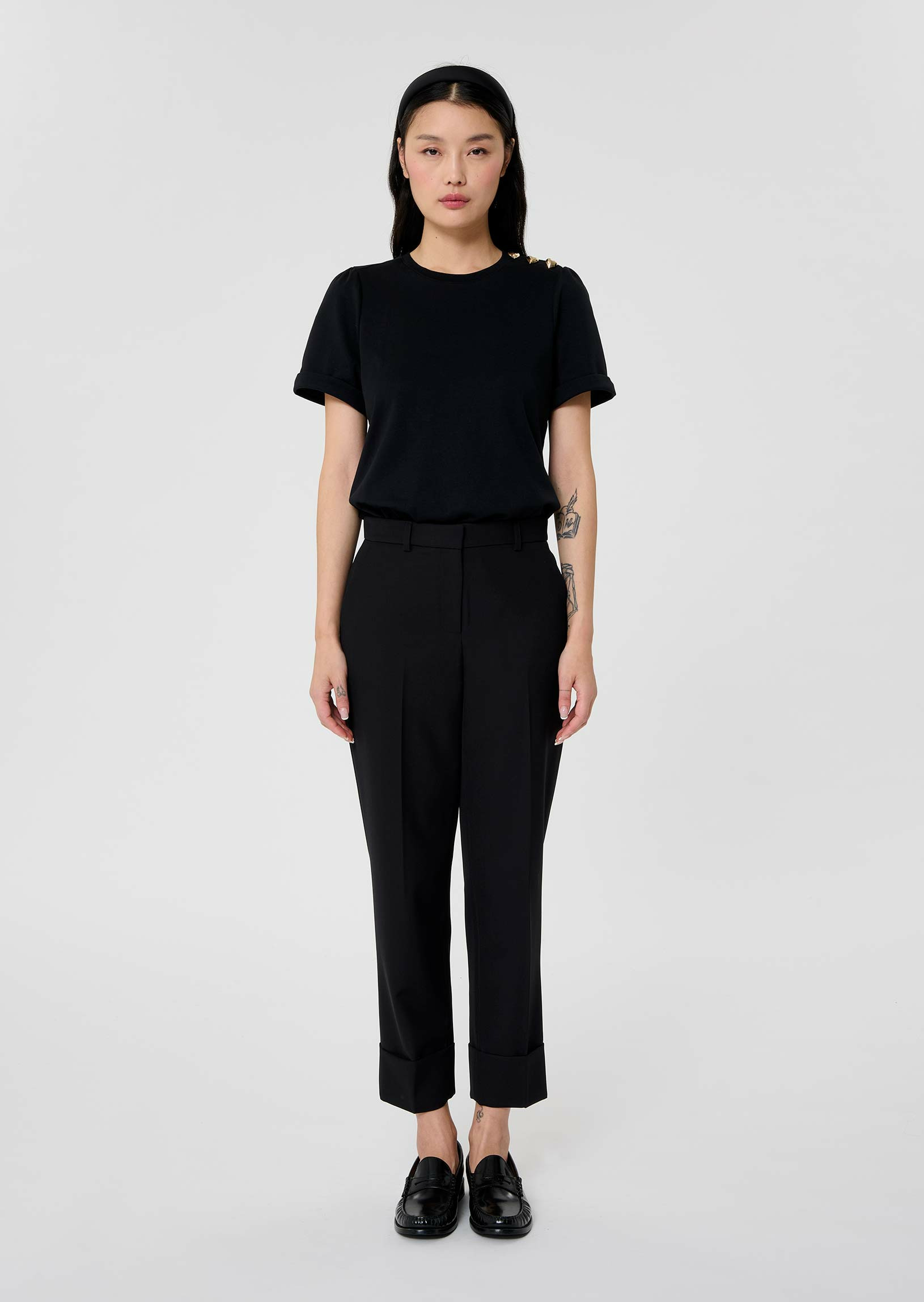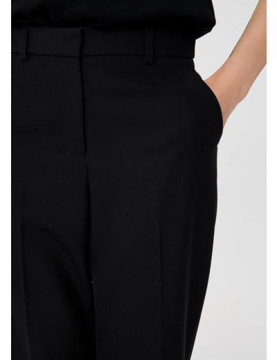 Confectionné dans un mélange de polyester recyclé et de laine vierge, ce pantalon allie douceur et tenue impeccable. Sa coupe précise souligne la silhouette sans contraindre, tandis que la doublure en viscose assure une sensation agréable au contact de la peau. Parfait pour passer de la journée au bureau à une soirée urbaine avec aisance.