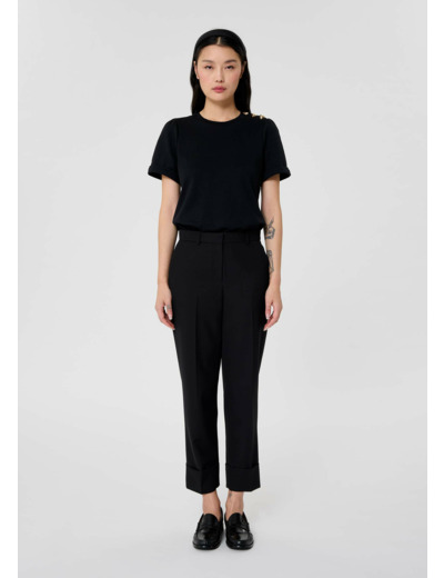 Basique de la garde robe, ce pantalon de tailleur noir en laine froide possède une coupe courte soulignée d'un large revers, une taille mi-haute et des plis plats.