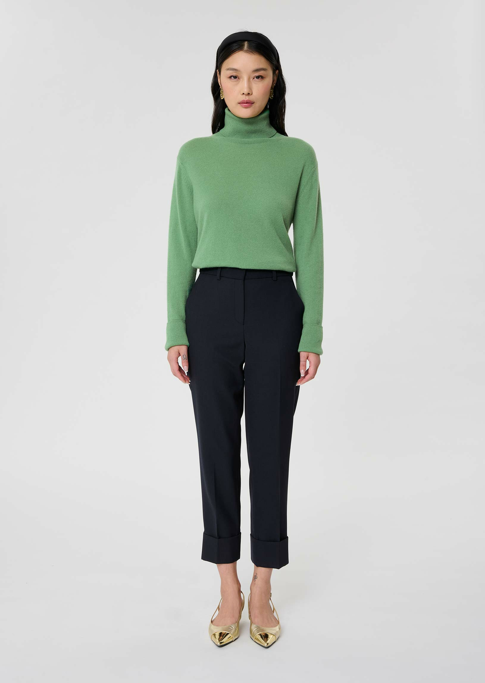 Basique de la garde robe, ce pantalon de tailleur couleur bleu nocturne en laine froide possède une coupe courte soulignée d'un large revers, une taille mi-haute et des plis plats.