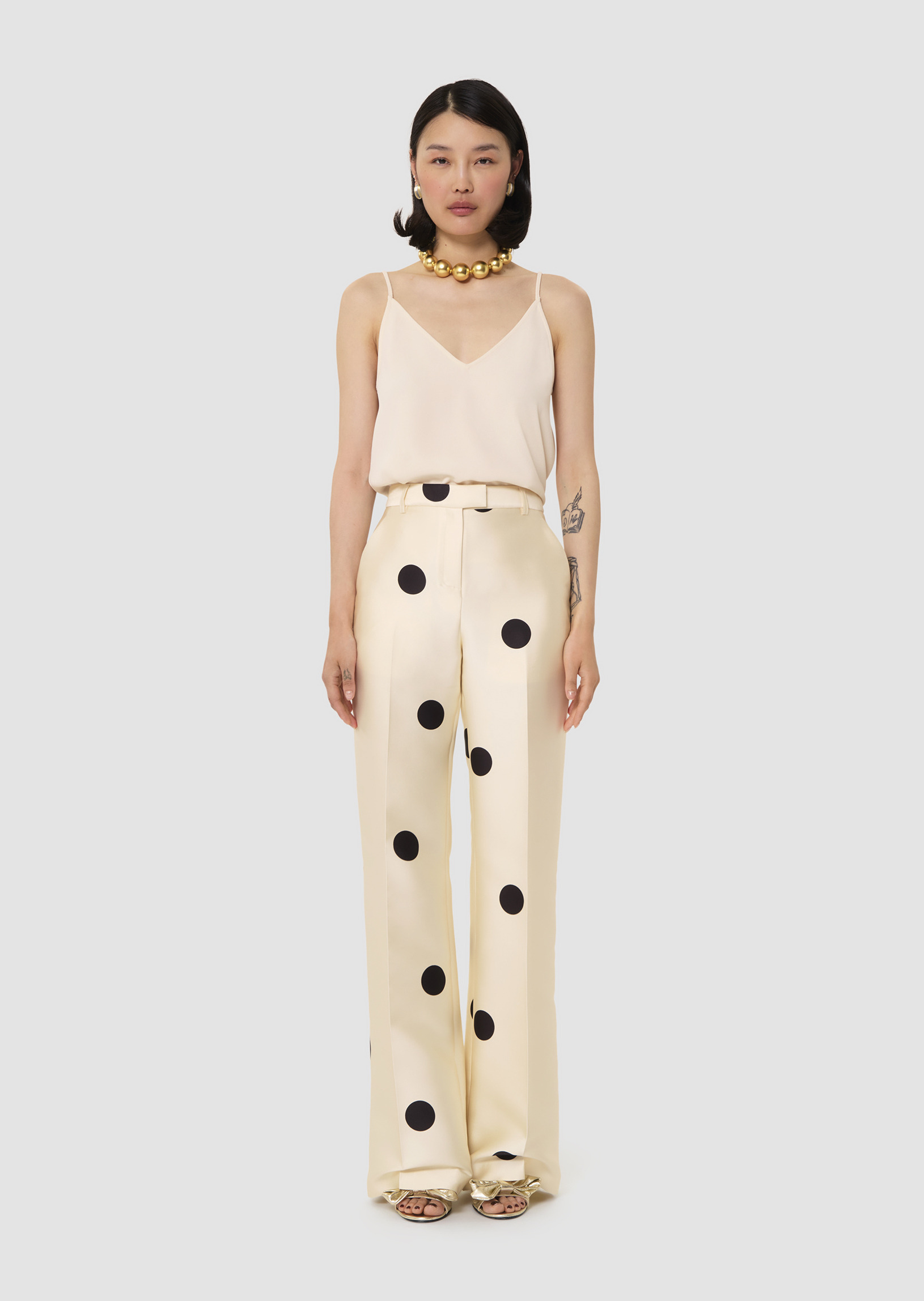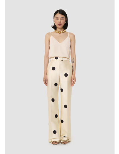 Ce pantalon écru confectionné en satin duchesse et imprimé gros pois noirs possède une taile haute, une jambe évasée marquée d'un pli plat, deux poches italiennes aux côtés et une poche passepoilée au dos. Il se ferme au devant par un zip et une agrafe.