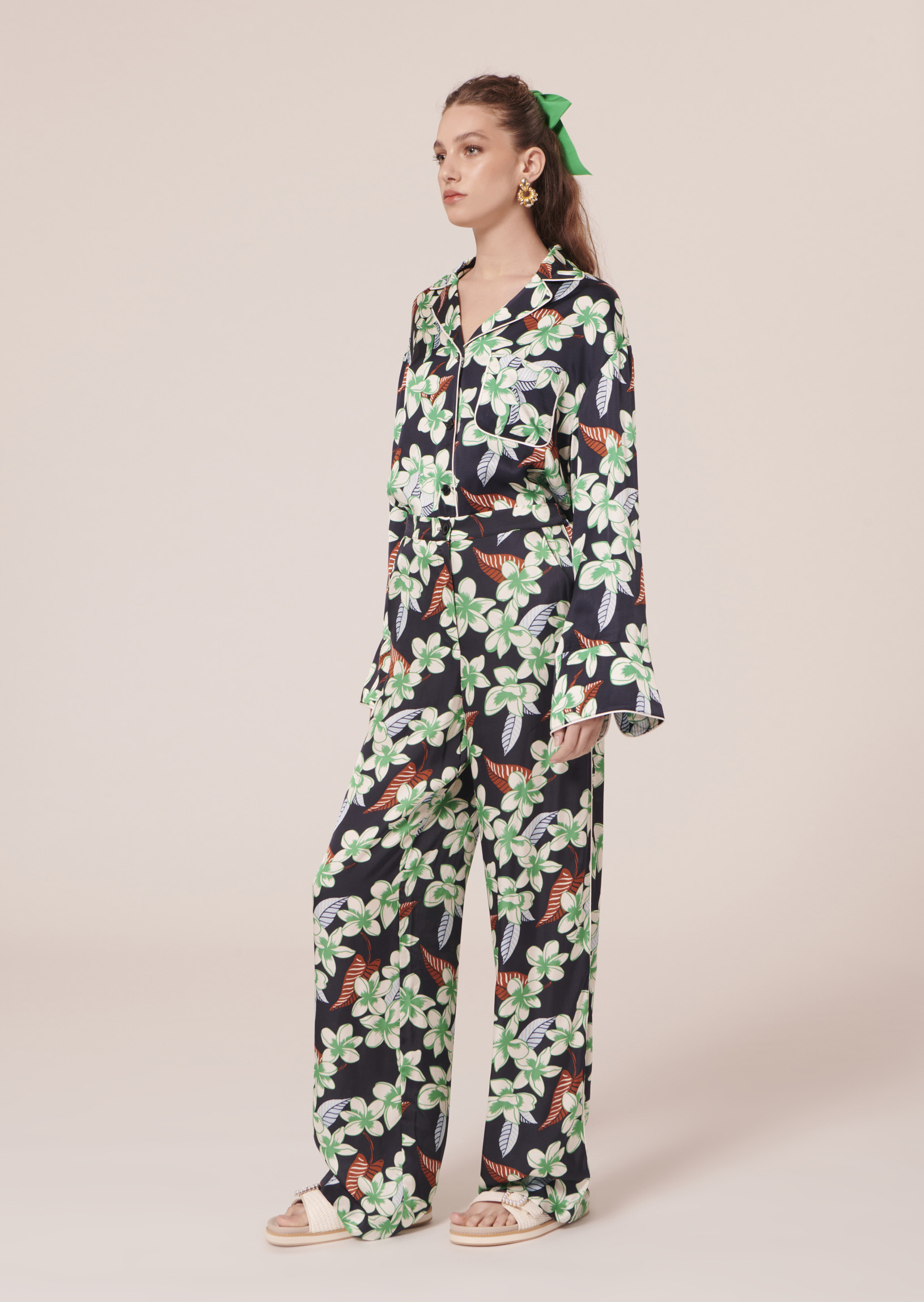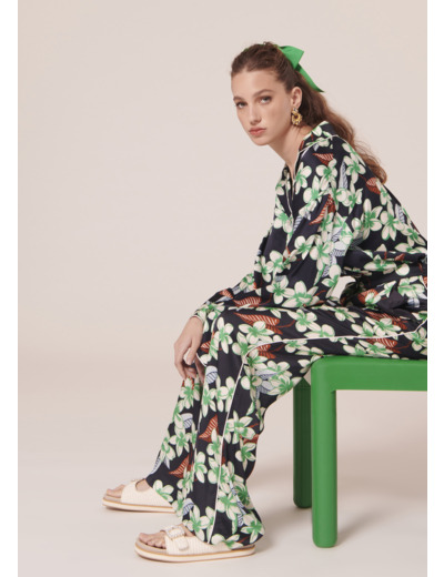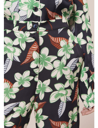 Ce pantalon reprend notre imprimé fleurs de Tiaré sur fond bleu nocturne. Il possède une jambe droite et fluide ainsi que deux poches aux côtés. Il se ferme par un zip et un petit bouton noir.