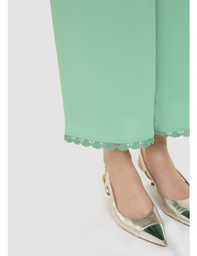 Ce pantalon vert en crêpe fluide possède une taille haute et une jambe ultra-large fluide 7/8ème. Son joli feston dentellé ton sur ton au bas lui apporte tout son esprit romantique. Fermeture par un zip invisible au dos.