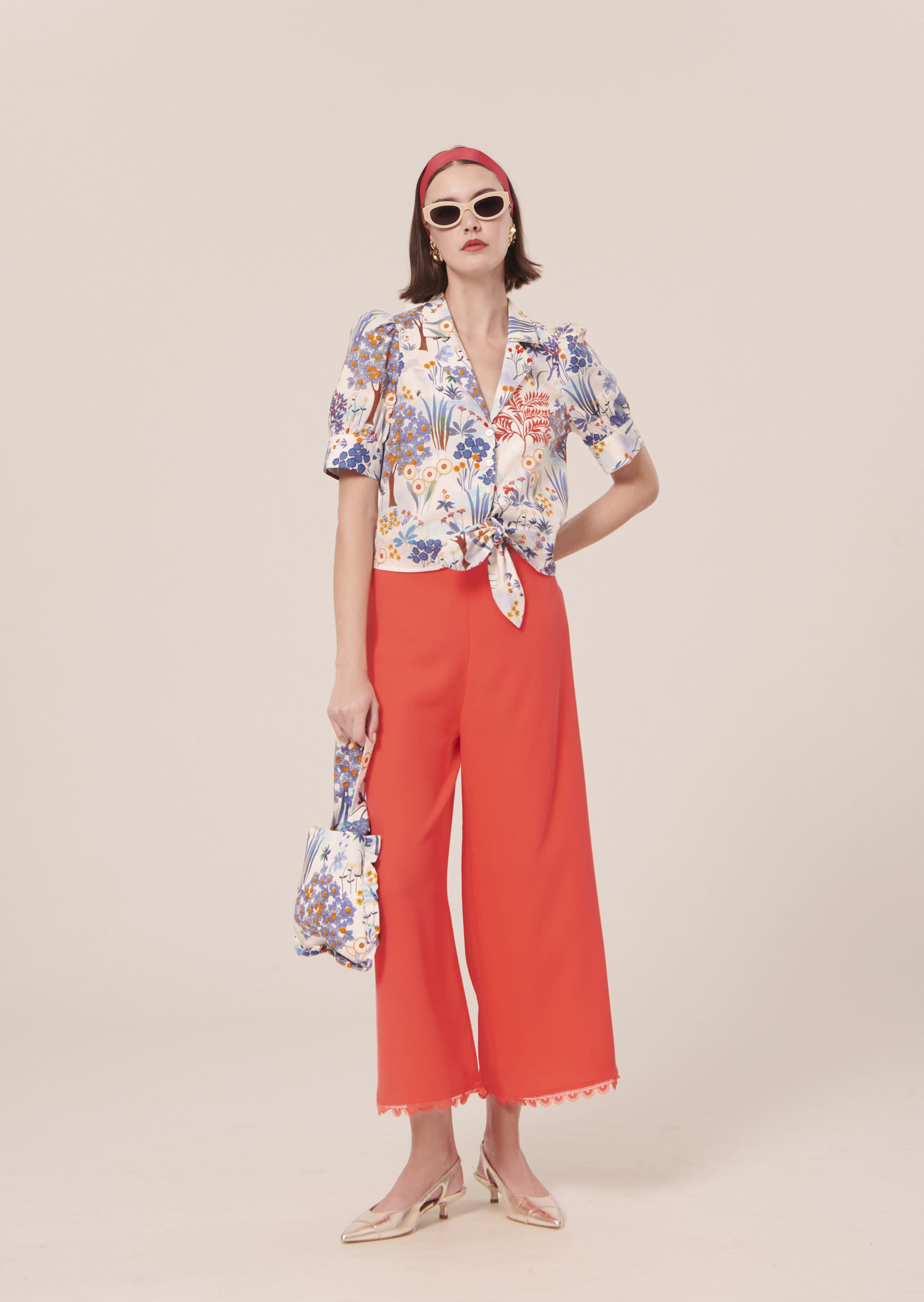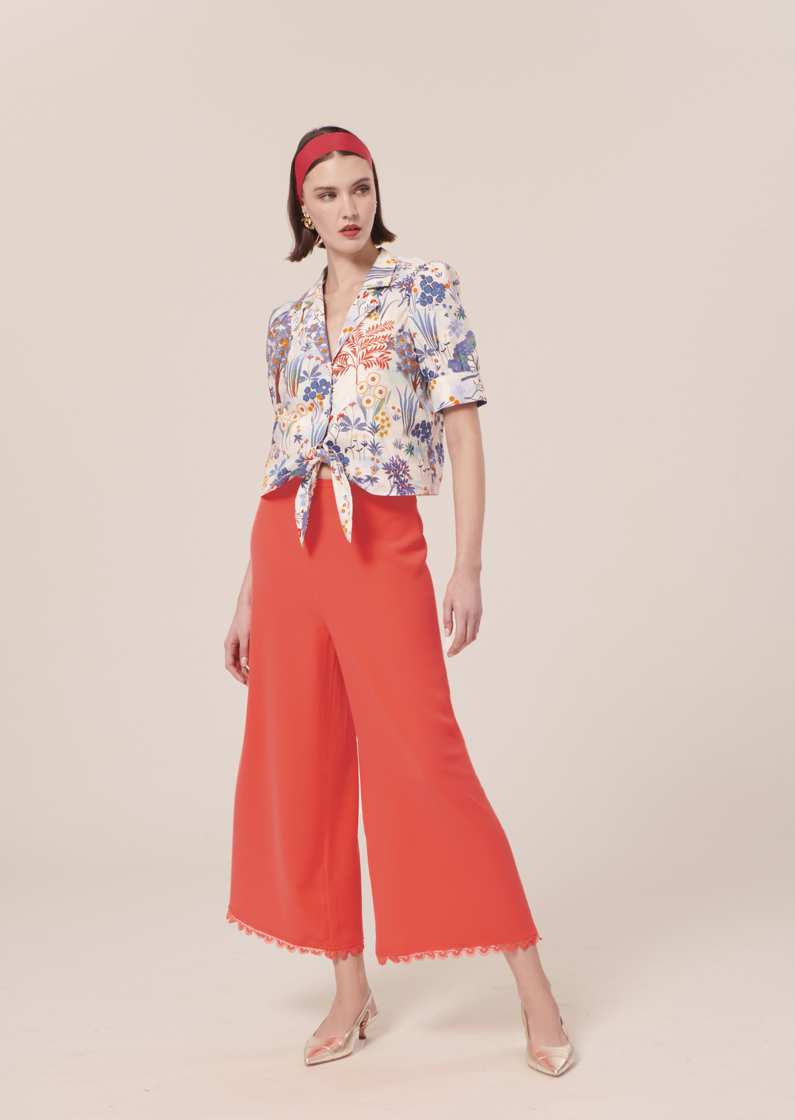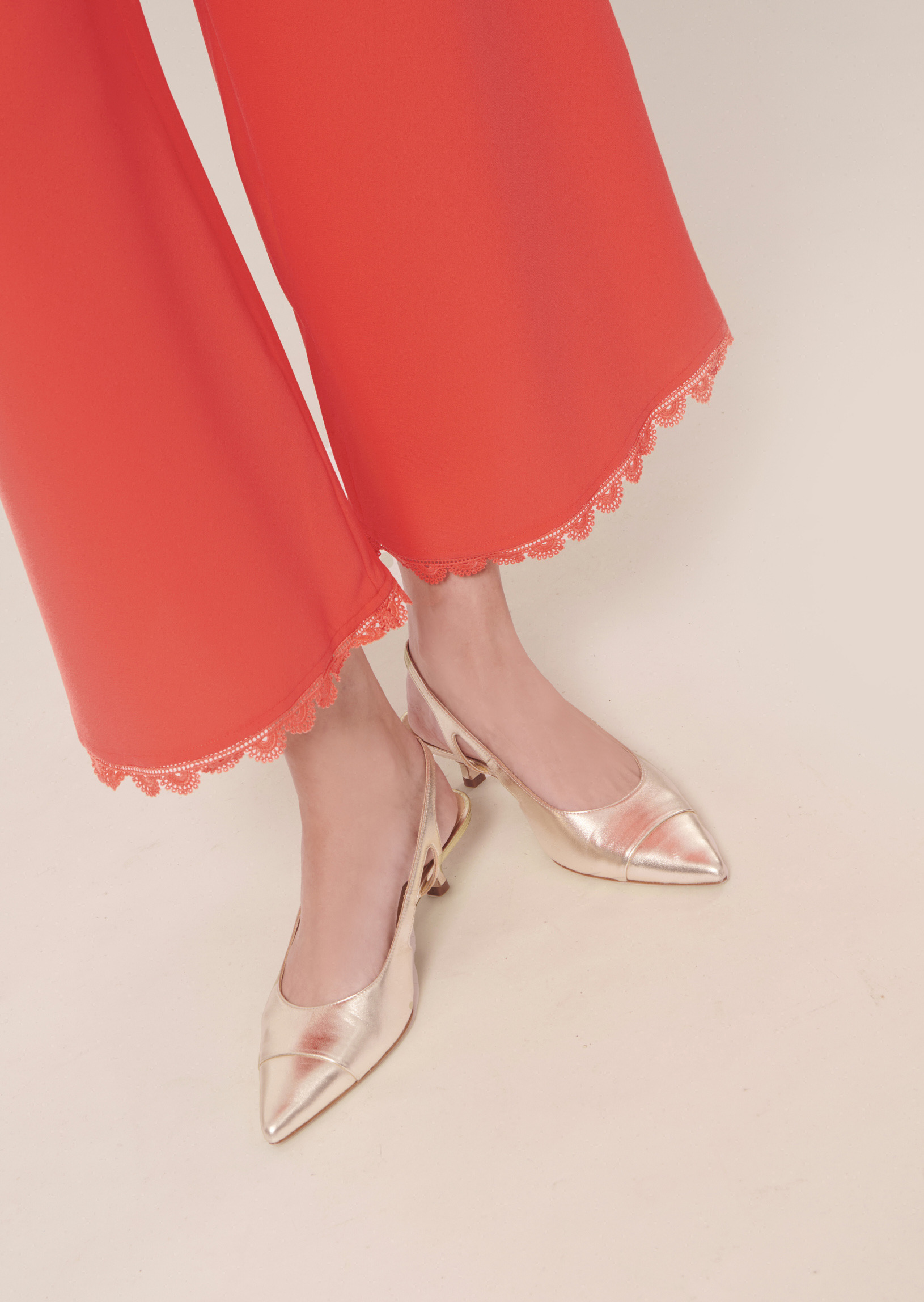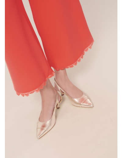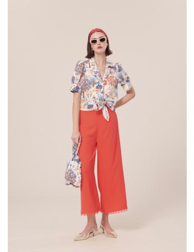 Ce pantalon taille haute couleur corail en crêpe possède une jambe large. Il est agrémenté au bas d'un joli feston dentellé ton sur ton. Fermeture par un zip invisible au dos.