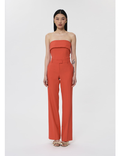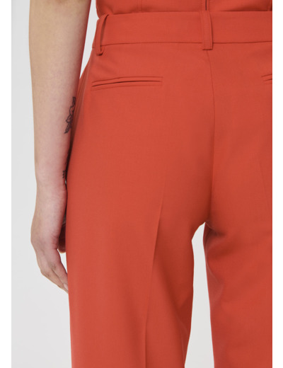 Ce pantalon tailleur en laine couleur rouge coquelicot possède une taille haute qui sublime parfaitement la silhouette et une jambe évasée. Il possède des poches italiennes aux côtés et des poches passepoilées au dos. Fermeture par zip et agrafe.
