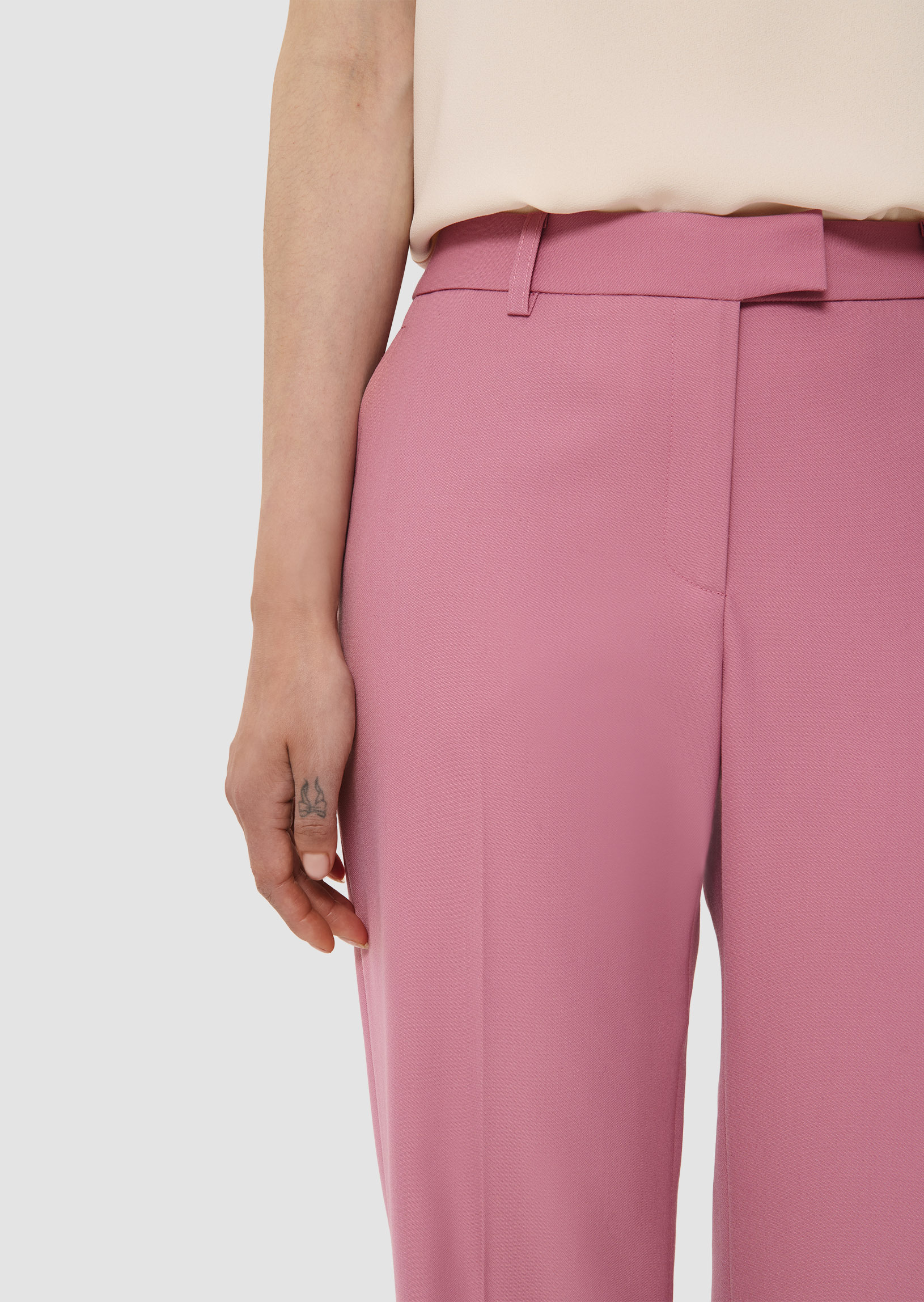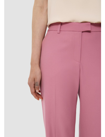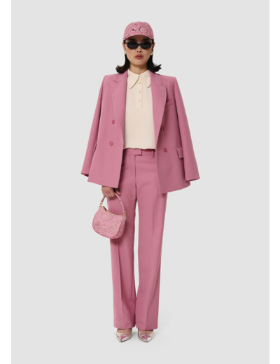 Ce pantalon tailleur en laine couleur bois de rose possède une taille haute qui sublime parfaitement la silhouette et une jambe évasée. Il possède des poches italiennes aux côtés et des poches passepoilées au dos. Fermeture par zip et agrafe.