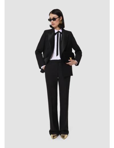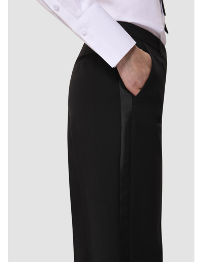 Ce pantalon noir possède une taille mi-haute et une jambe évasée à pli plat. Son esprit smocking réside dans la bande noire satinée contrastante aux côtés. Il possède des poches italiennes et se ferme par un zip au côté.