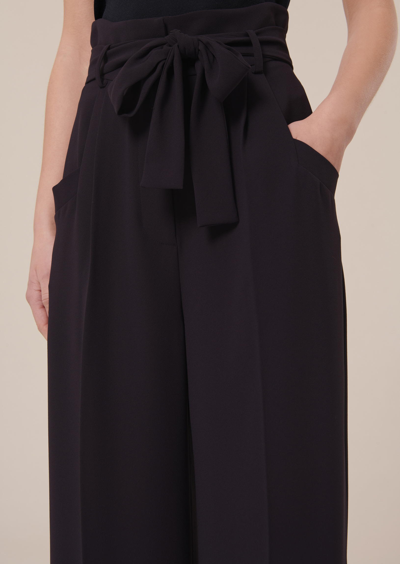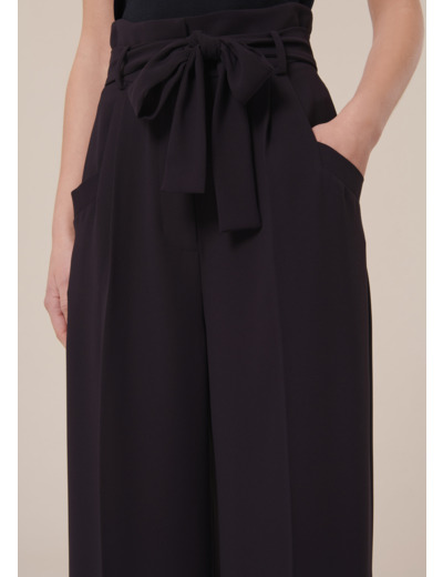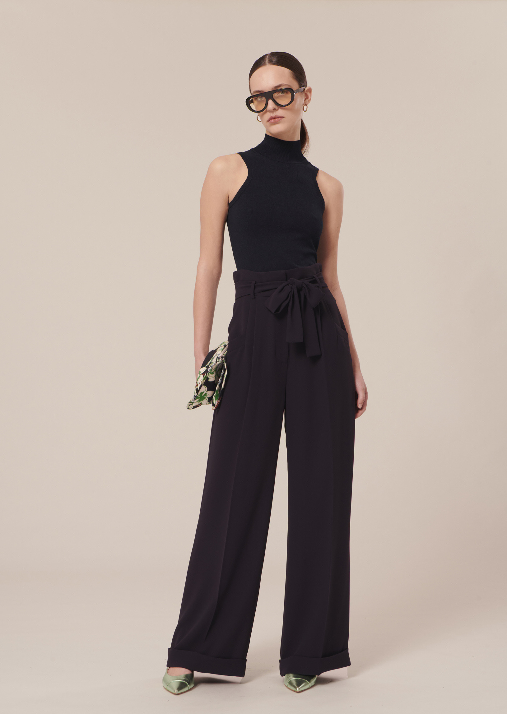 Notre iconique pantalon Pyla est de retour en bleu nocturne cette saison. En crêpe fluide, il possède une jambe large et la taille haute marquée d'une ceinture ton sur ton avec de larges poches aux côtés et des revers au bas pour une allure toujours aussi élégante.