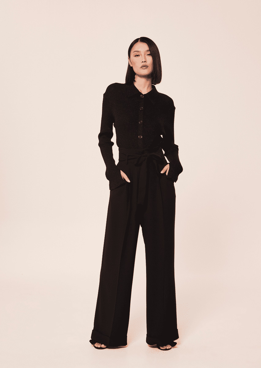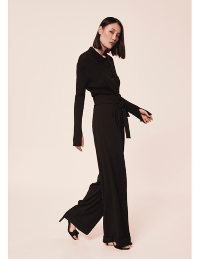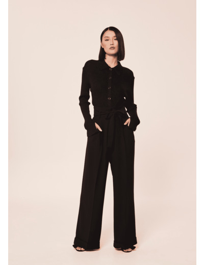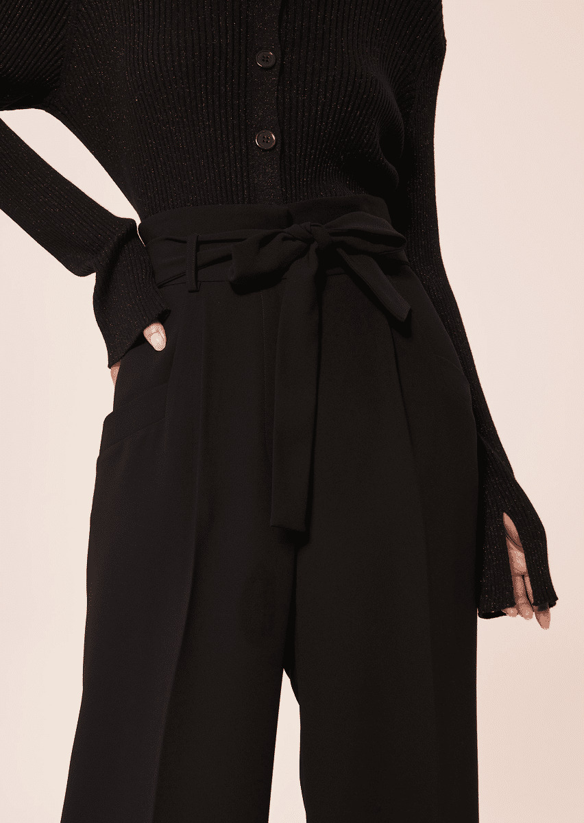 Notre iconique pantalon Pyla est de retour en noir cette saison. En crêpe fluide, il possède une jambe large et la taille haute marquée d'une ceinture ton sur ton avec de larges poches aux côtés et des revers au bas pour une allure toujours aussi élégante.
