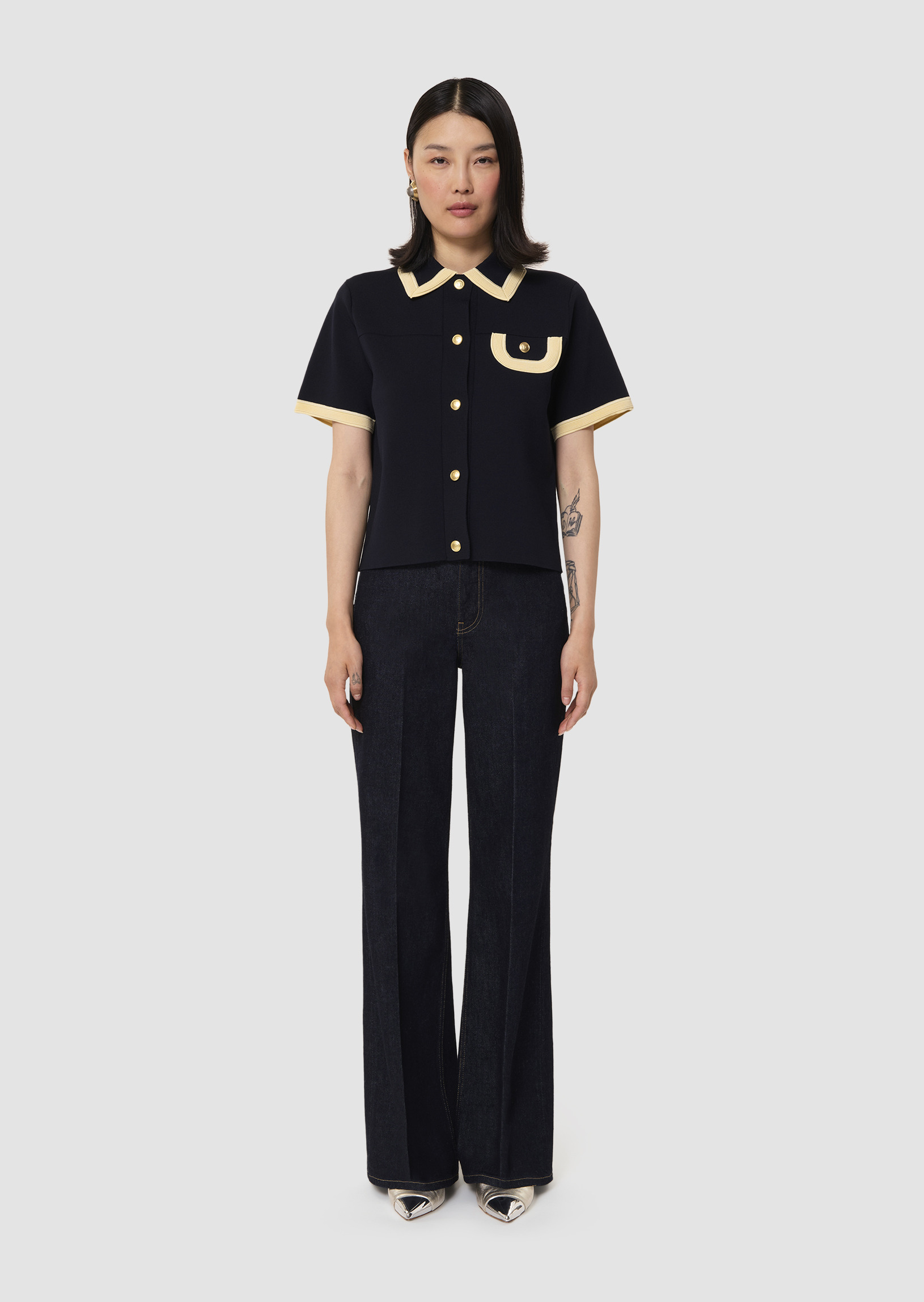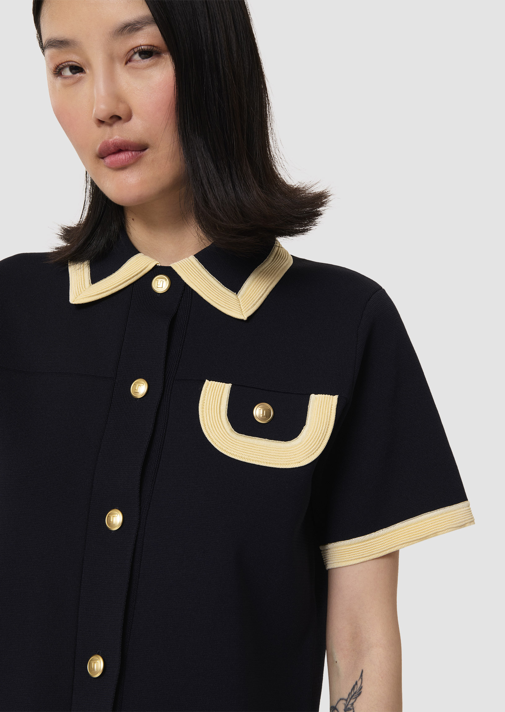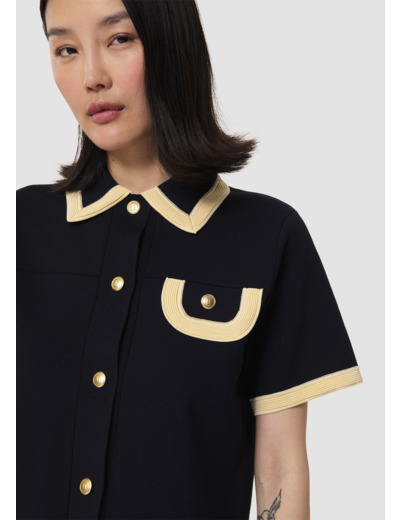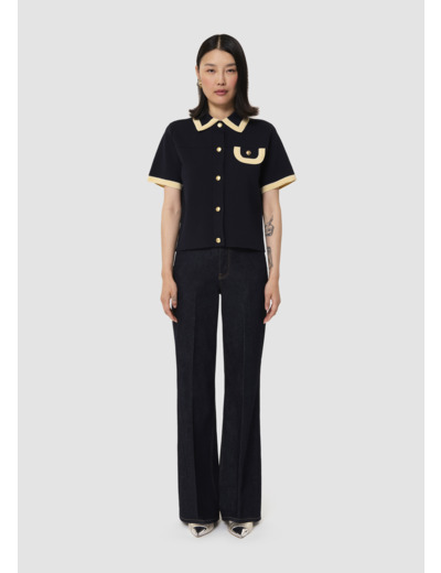 Ce pull possède un col chemise, des manches courtes et une poche à rabat à la poitrine, soulignés par un large liseré couleur vanille contrastant avec l'ensemble. Il se ferme au devant par des boutons dorés décorés du monogramme de la maison.