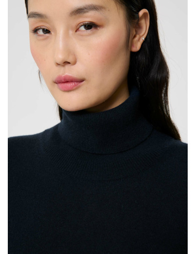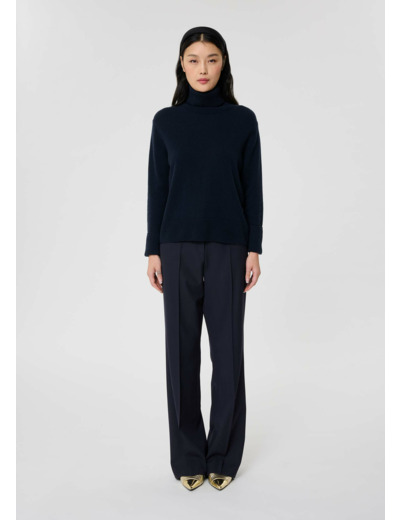 Ce pull couleur bleu nuit en cachemire, possède une coupe droite, des manches longues et un col roulé. De larges bords-côtes marquent le bas et les manches.