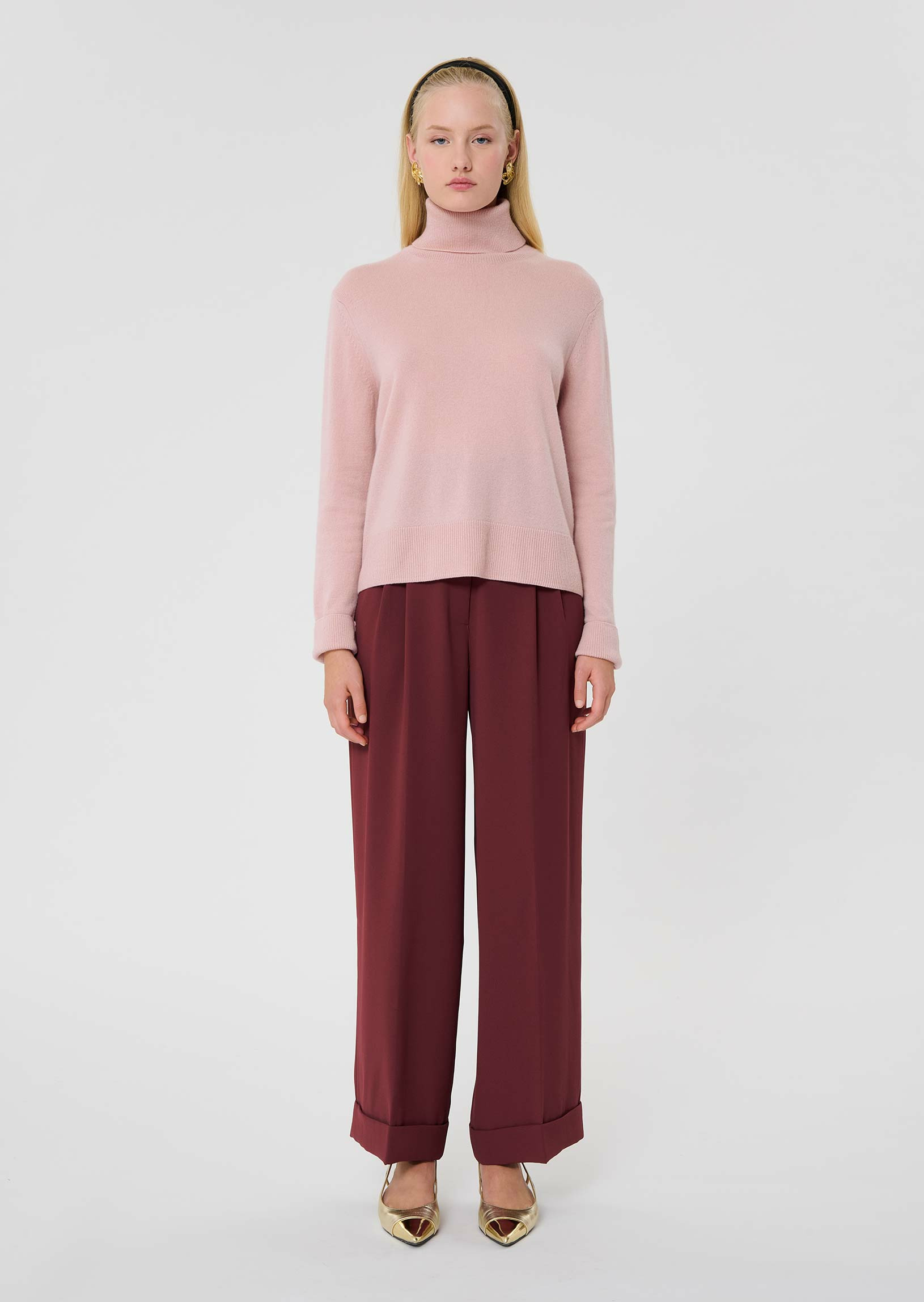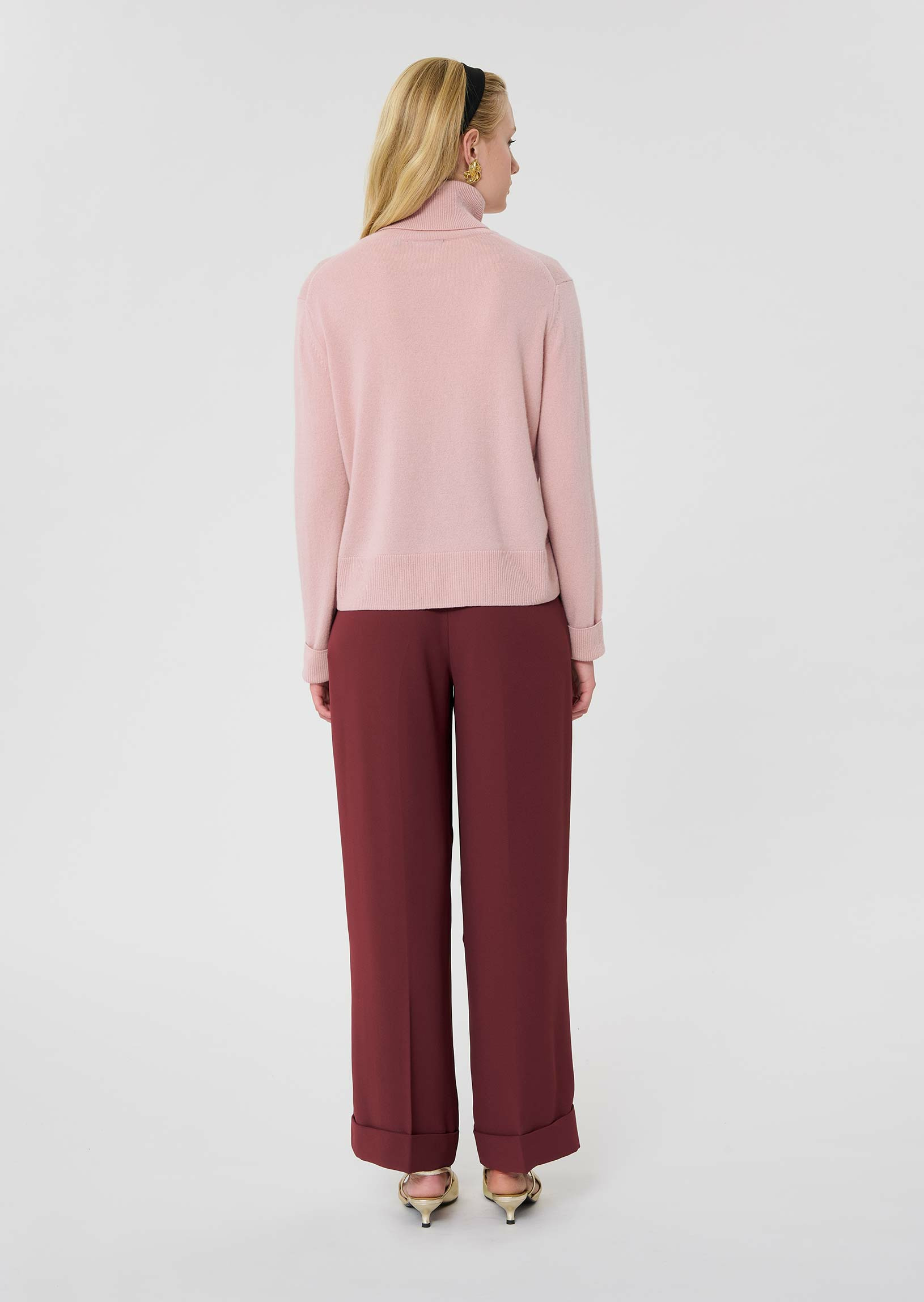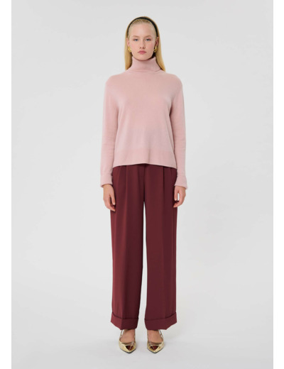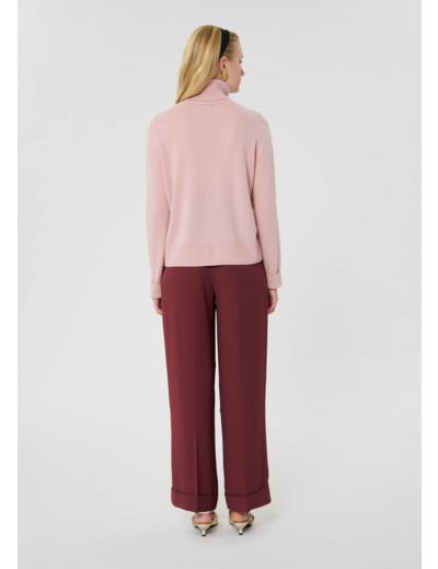 Ce pull couleur vieux rose en cachemire, possède une coupe droite, des manches longues et un col roulé. De larges bords-côtes marquent le bas et les manches.