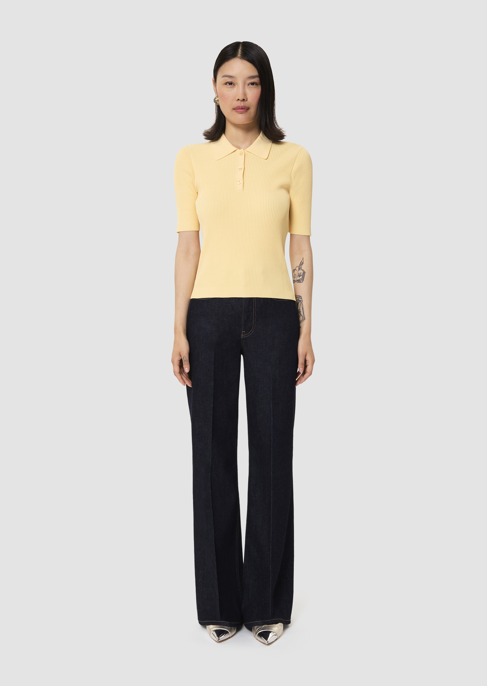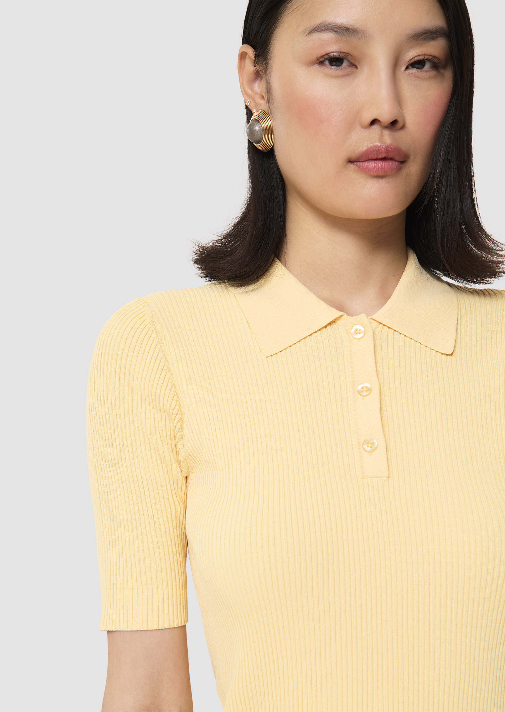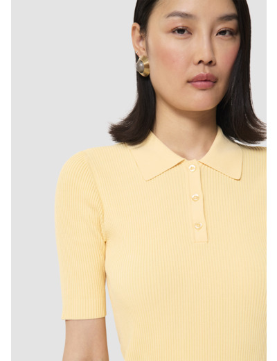 Ce polo couleur vanille en maille fine épouse parfaitement la silhouette. Il possède des manches courtes et un col chemise qui se boutonne par trois petits boutons ton sur ton.