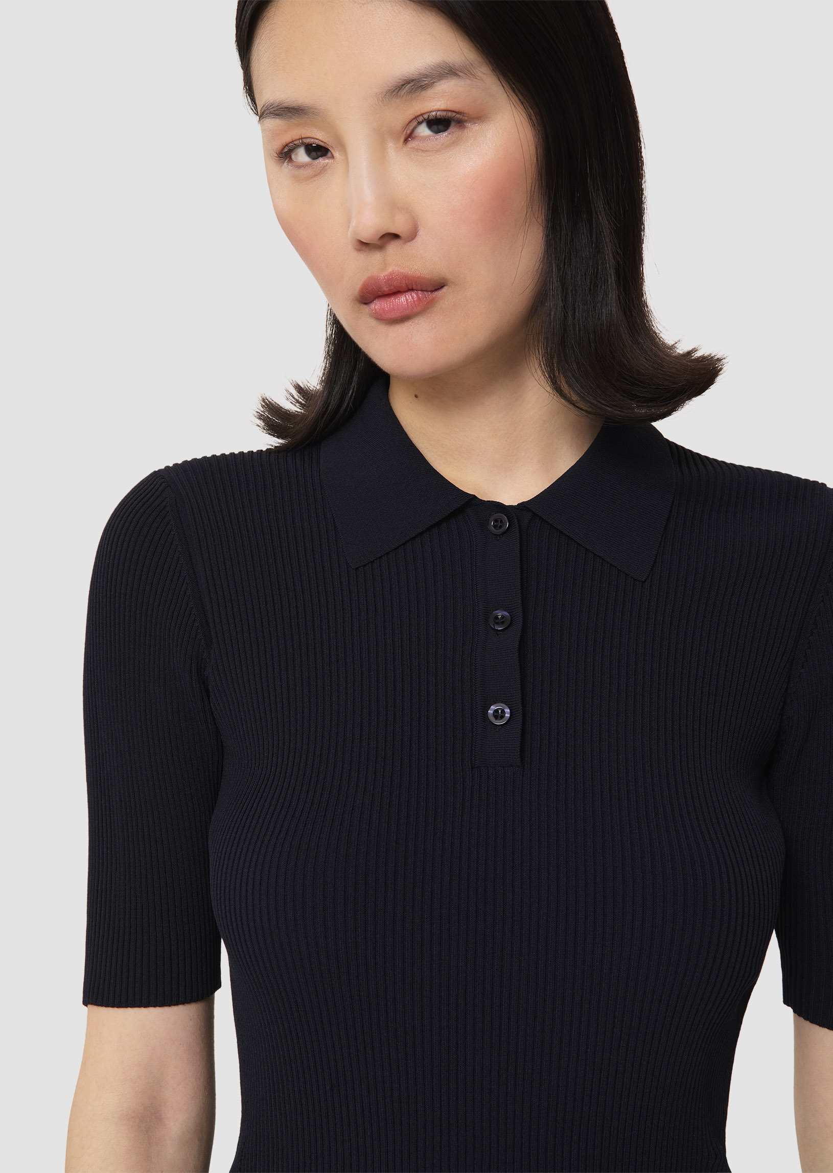 Ce polo bleu nuit en maille fine épouse parfaitement la silhouette. Il possède des manches courtes et un col chemise qui se boutonne par trois petits boutons ton sur ton.