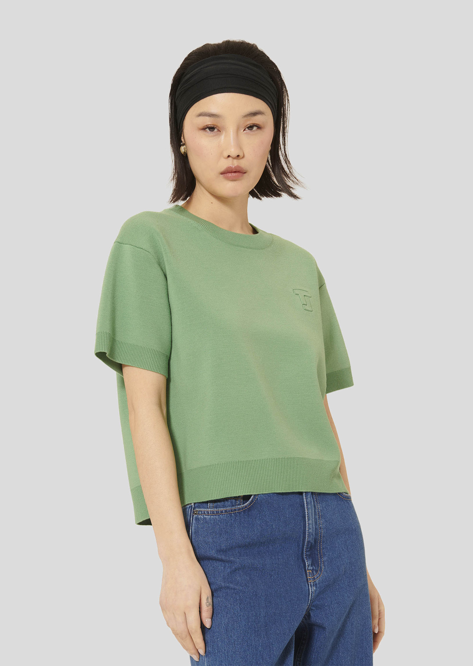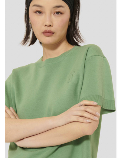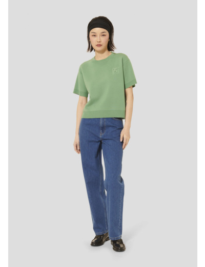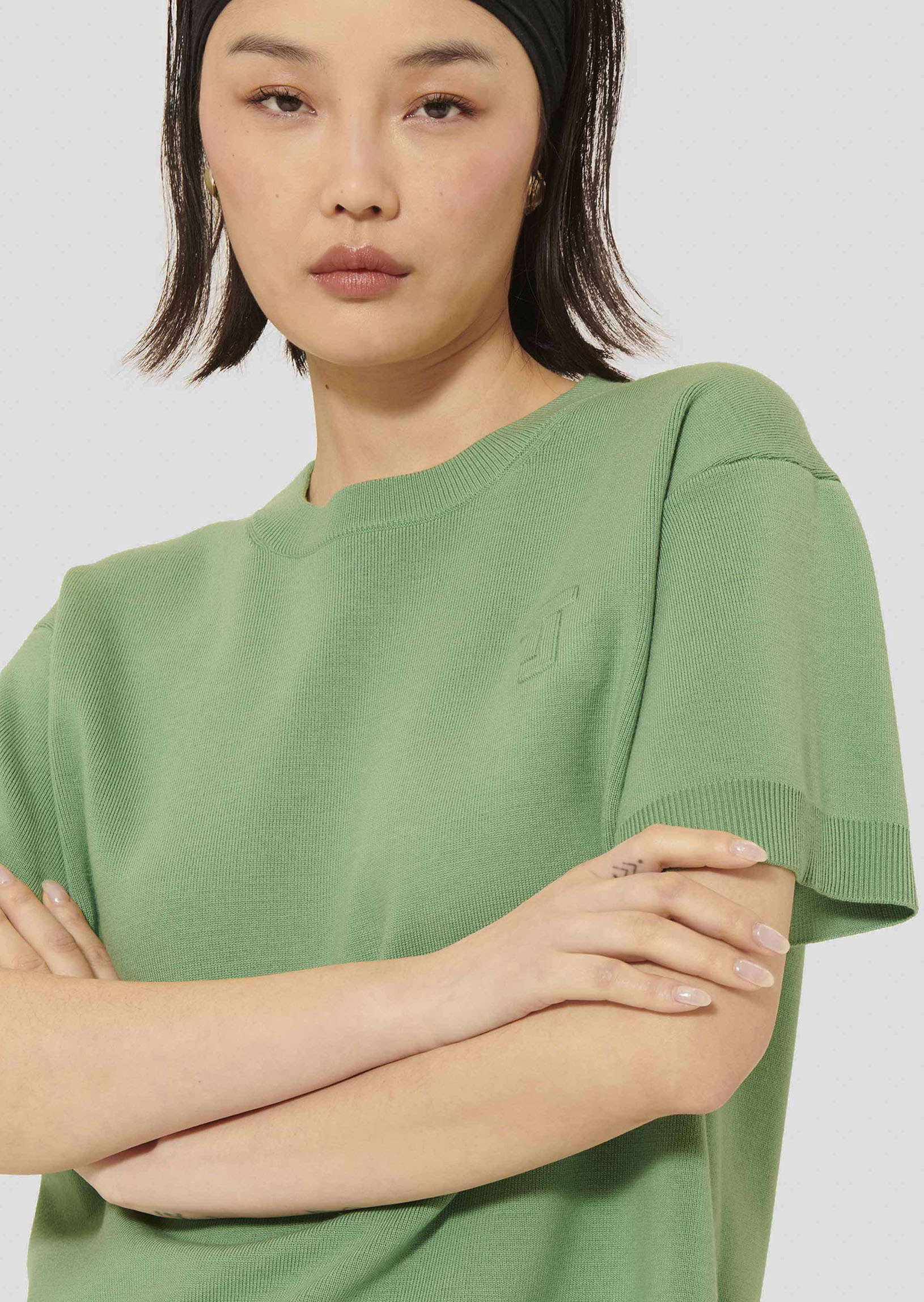 Ce pull couleur amande en laine mérinos possède une coupe droite, une encolure ronde et des manches courtes. De larges bords-côtes marquent le bas, l'encolure et les poignets. Le monogramme de la maison est délicatement gravé sur la poitrine.