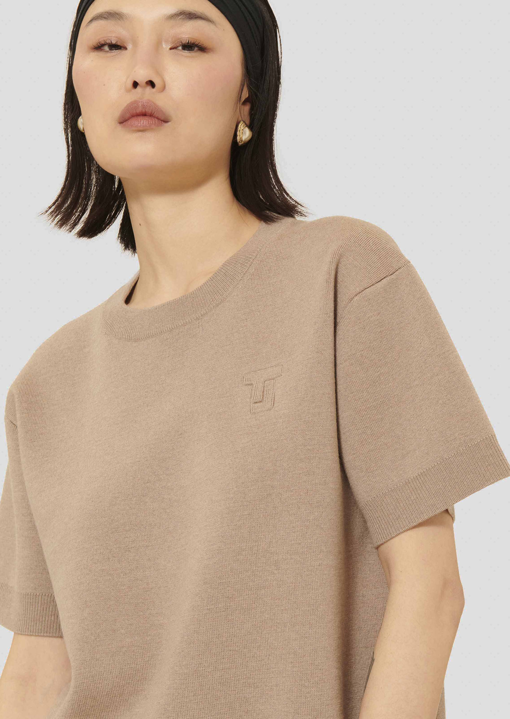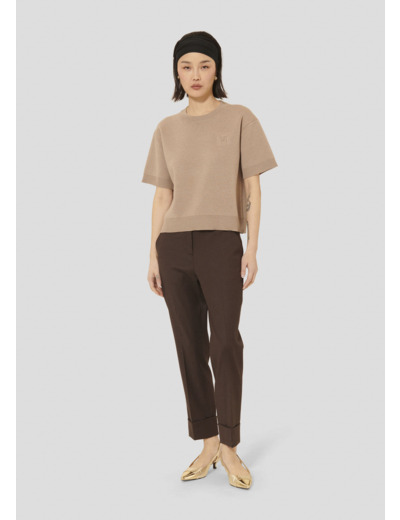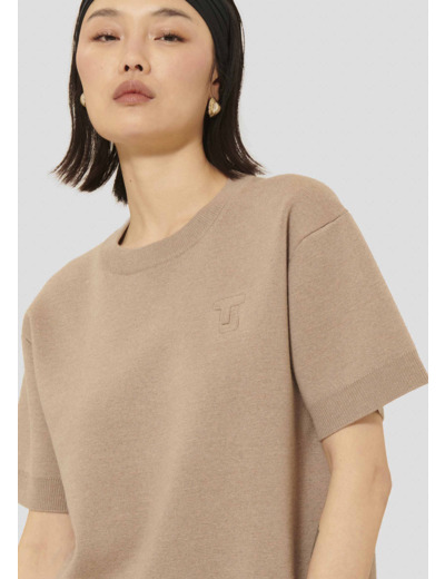 Ce pull couleur noisette en laine mérinos possède une coupe droite, une encolure ronde et des manches courtes. De larges bords-côtes marquent le bas, l'encolure et les poignets. Le monogramme de la maison est délicatement gravé sur la poitrine.