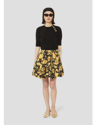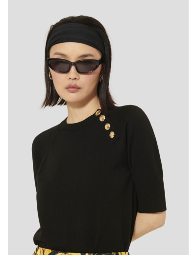 Ce pull noir possède des manches courtes et un col rond. La touche so Tara est apportée par les boutons dorés ornés du monogramme de la maison qui décorent son épaule gauche. Il est confectionné en laine douce qui lui confère un toucher cachemire ultra confortable. On le porte avec le gilet Gyslain assorti pour un matching set ultra élégant.