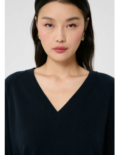 Ce pull bleu nuit en cachemire possède des manches longues et un col V. Des bords-cotes ton sur ton décorent le bas, les poignets et l'encolure.