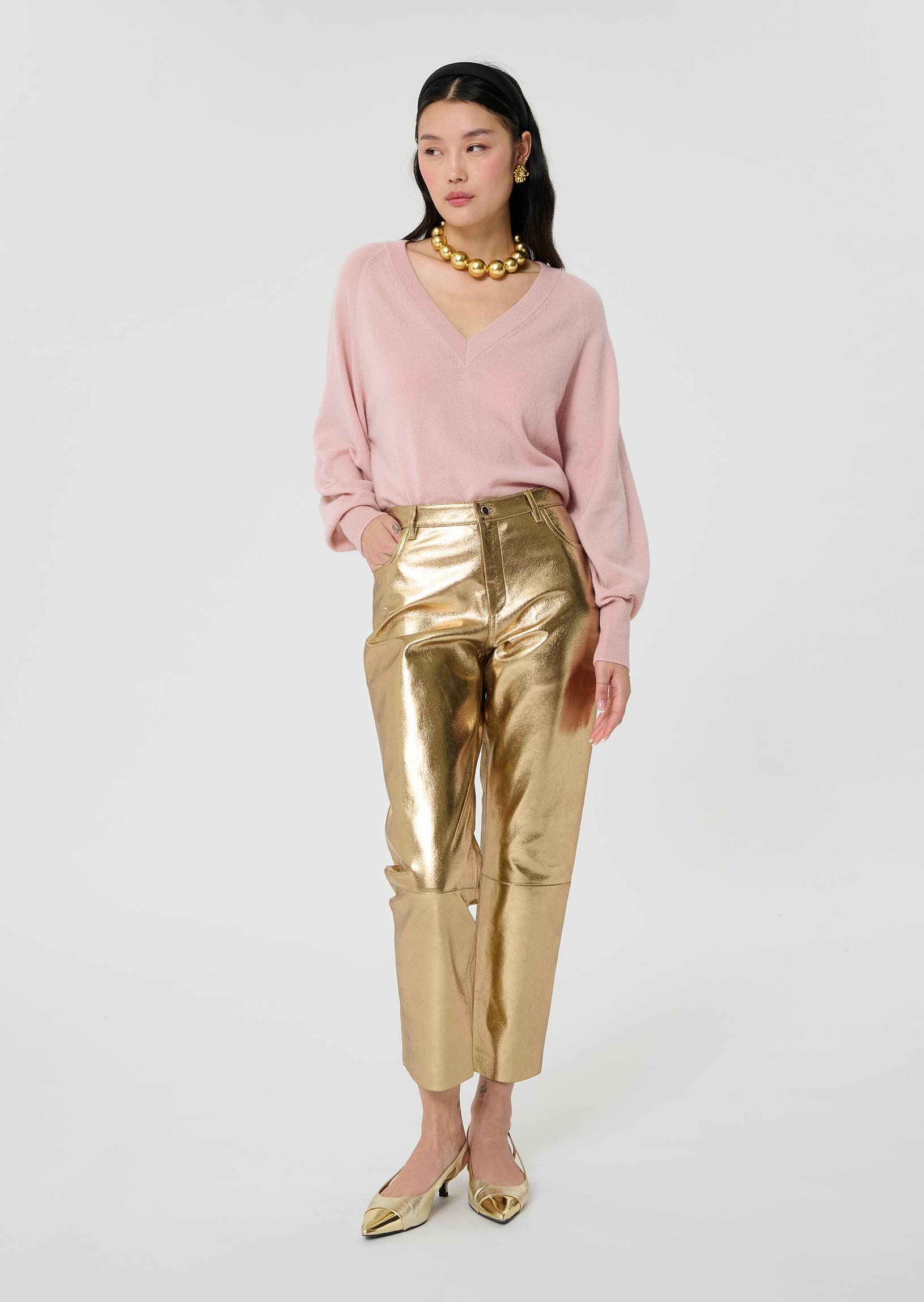 Ce pull couleur vieux rose en cachemire possède des manches longues et un col V. Des bords-cotes ton sur ton décorent le bas, les poignets et l'encolure.
